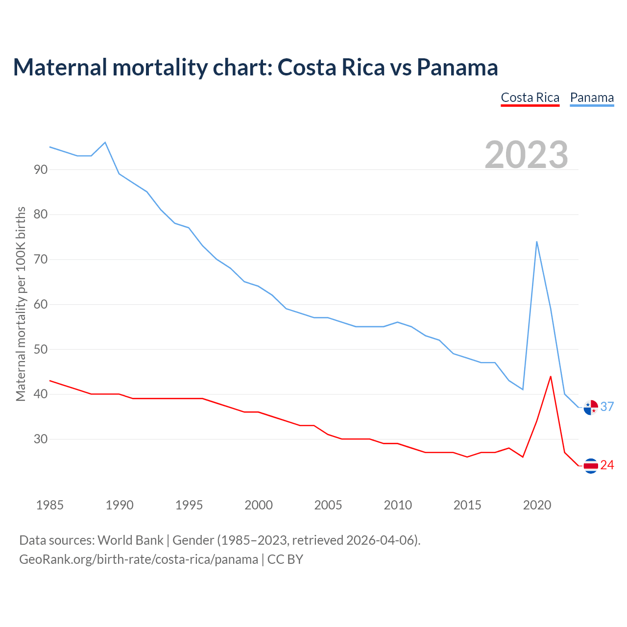 The maternal mortality rate, which is the probability of dying during childbirth or within 42 days of pregnancy termination, is 24 deaths per 100,000 live births in Costa Rica, compared to 37 deaths in Panama.