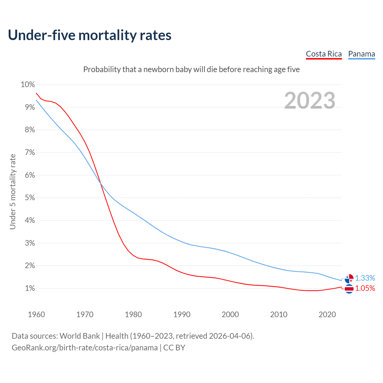 The chance that a newborn baby will die before reaching age five is 1.05% in Costa Rica and 1.33% in Panama. Above is a chart with historical data on under-five mortality rates.