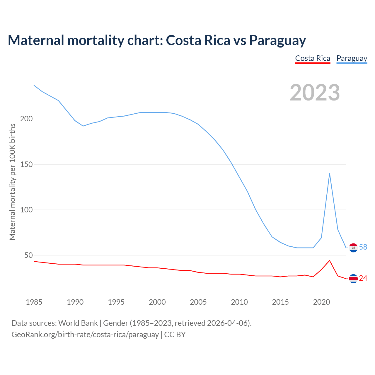 The maternal mortality rate, which is the probability of dying during childbirth or within 42 days of pregnancy termination, is 24 deaths per 100,000 live births in Costa Rica, compared to 58 deaths in Paraguay.