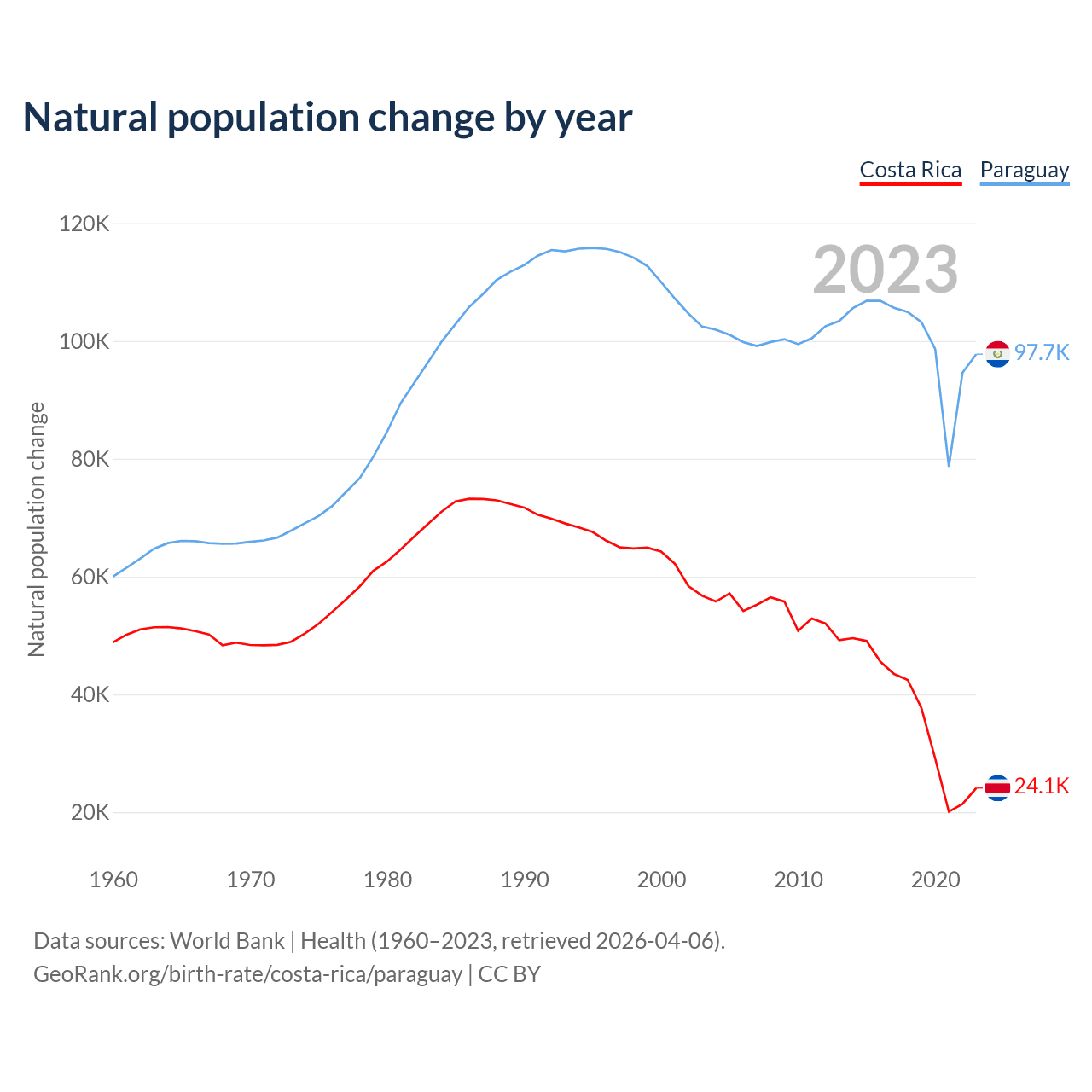 According to the latest available data on birth rates, the fertility rate in Costa Rica was 1.33 children per woman in 2023, compared to 2.42 in Paraguay in 2023. The replacement level is considered to be 2.1 children per woman.