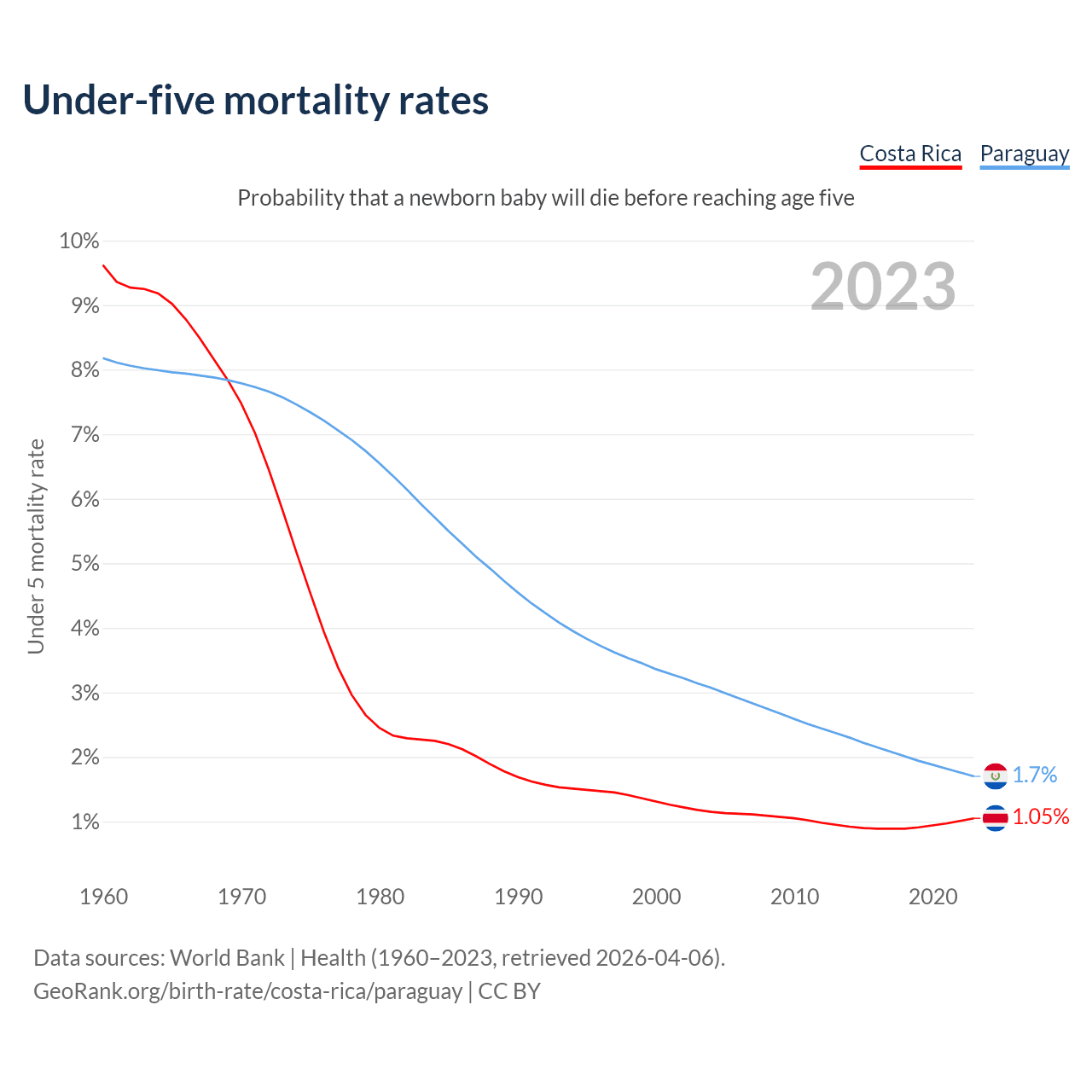 The chance that a newborn baby will die before reaching age five is 1.05% in Costa Rica and 1.7% in Paraguay. Above is a chart with historical data on under-five mortality rates.