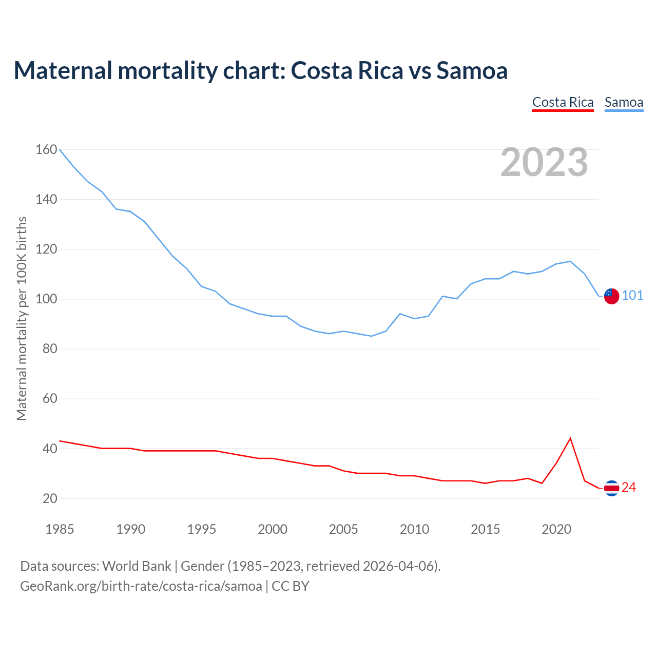 The maternal mortality rate, which is the probability of dying during childbirth or within 42 days of pregnancy termination, is 24 deaths per 100,000 live births in Costa Rica, compared to 101 deaths in Samoa.