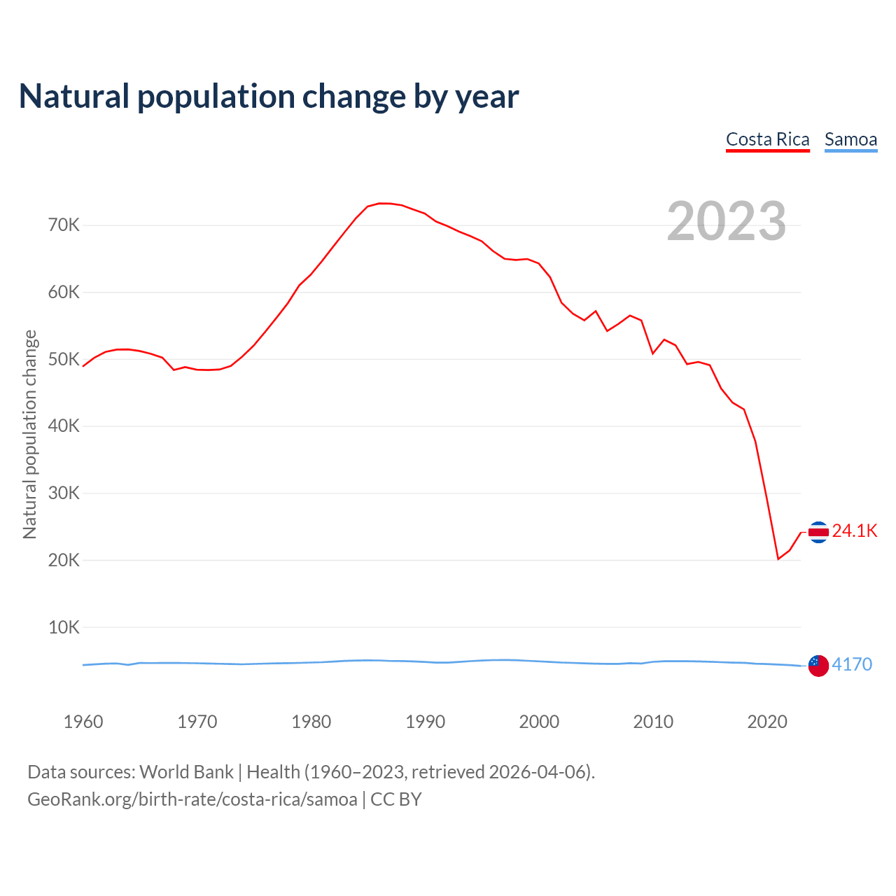 Costa Rica has an annual birth rate of 10.2 births per 1,000 people, compared to 25.4 for Samoa. The average number of children a woman is expected to have during her lifetime — the fertility rate, is 1.33 in Costa Rica and 3.83 in Samoa — 187.9% difference.