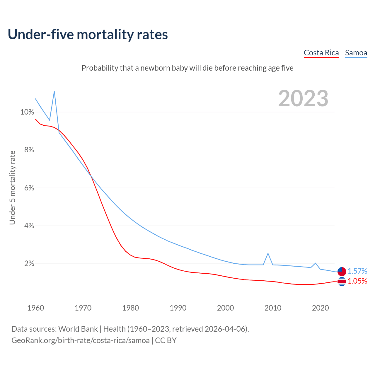 The chance that a newborn baby will die before reaching age five is 1.05% in Costa Rica and 1.57% in Samoa. Above is a chart with historical data on under-five mortality rates.