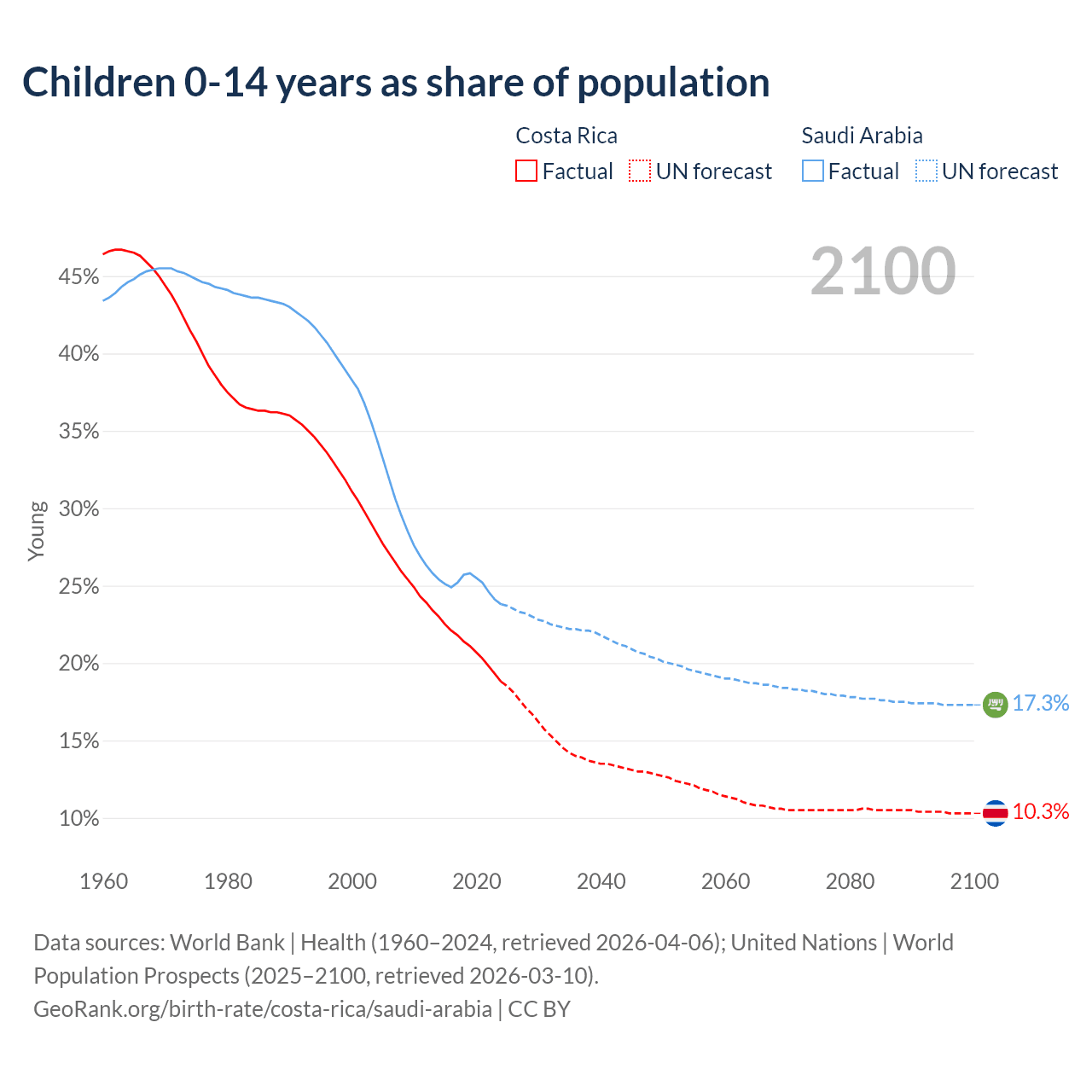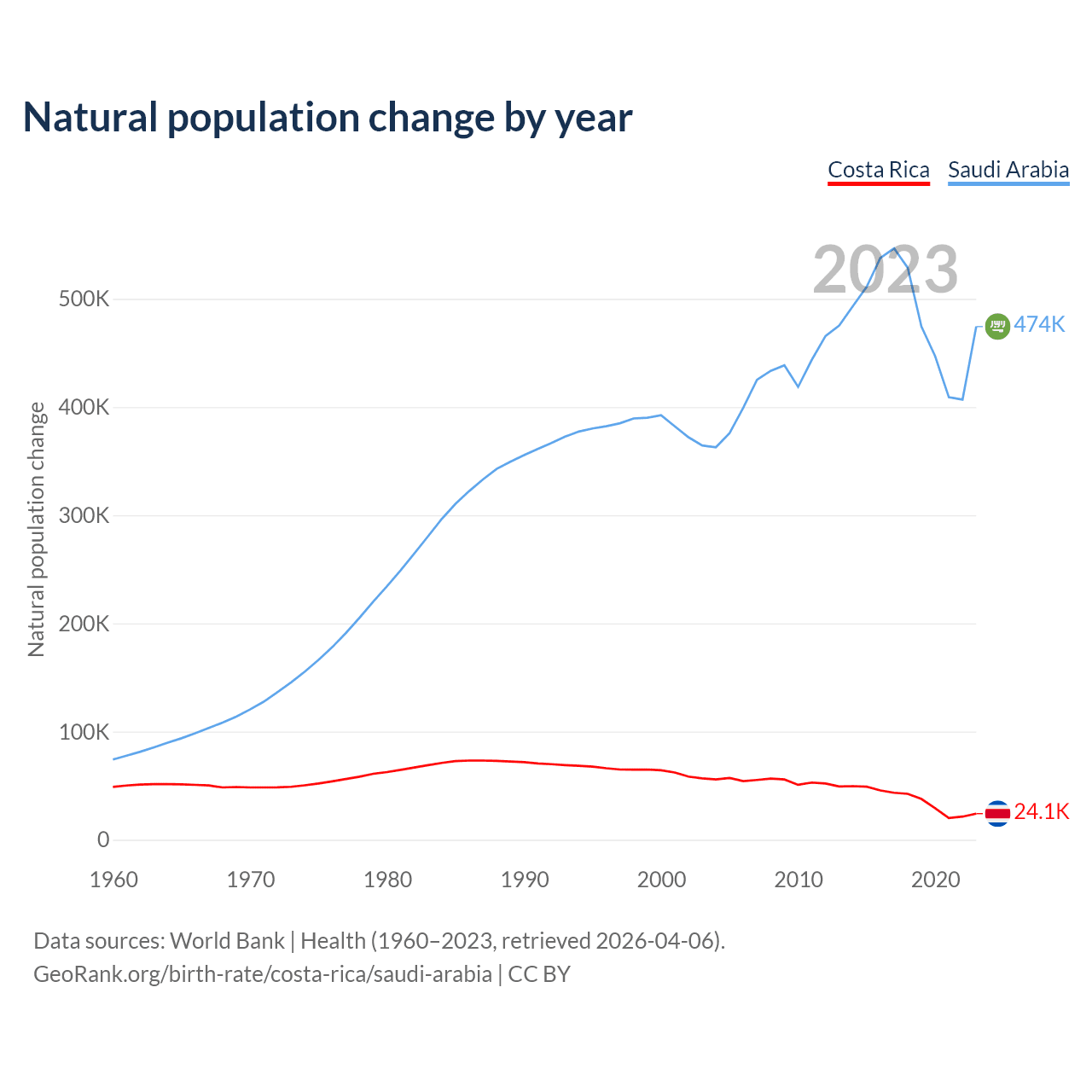 According to the latest available data on birth rates, the fertility rate in Costa Rica was 1.33 children per woman in 2023, compared to 2.28 in Saudi Arabia in 2023. The replacement level is considered to be 2.1 children per woman.