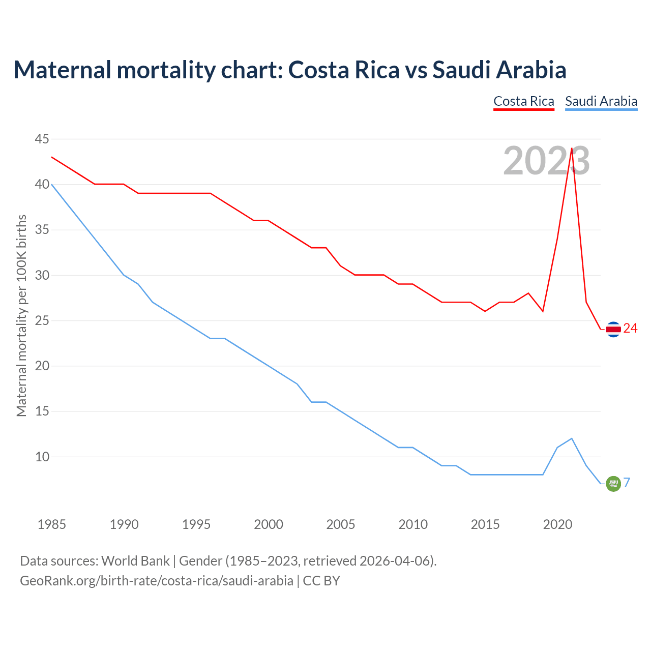 The maternal mortality rate, which is the probability of dying during childbirth or within 42 days of pregnancy termination, is 24 deaths per 100,000 live births in Costa Rica, compared to 7 deaths in Saudi Arabia.