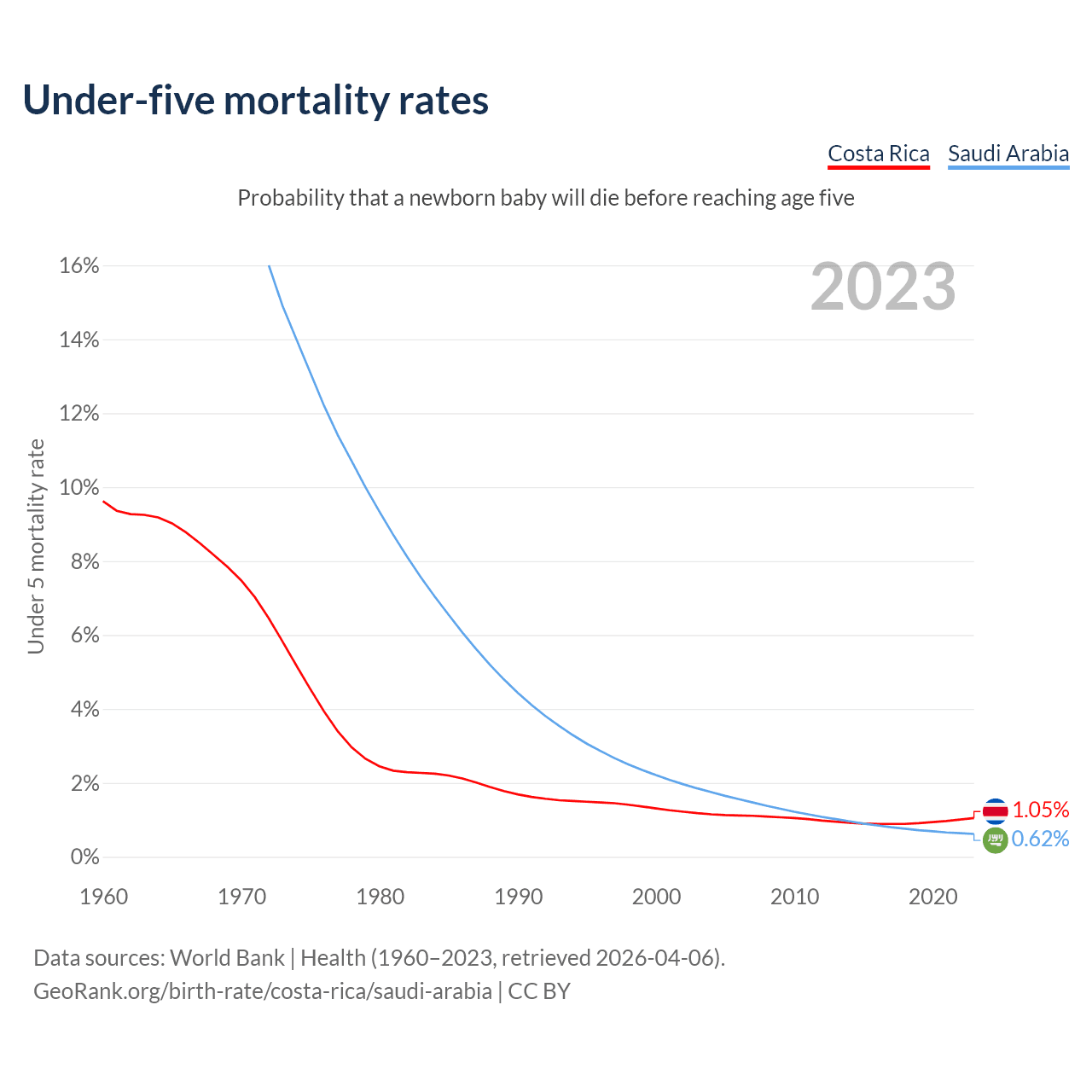 The chance that a newborn baby will die before reaching age five is 1.05% in Costa Rica and 0.62% in Saudi Arabia. Above is a chart with historical data on under-five mortality rates.
