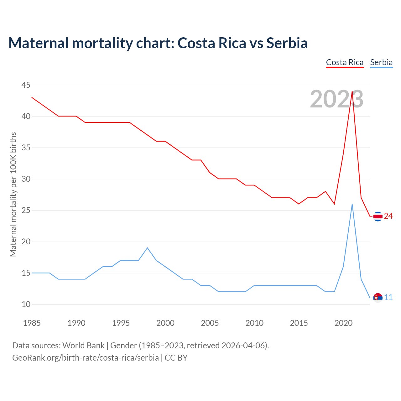 The maternal mortality rate, which is the probability of dying during childbirth or within 42 days of pregnancy termination, is 24 deaths per 100,000 live births in Costa Rica, compared to 11 deaths in Serbia.