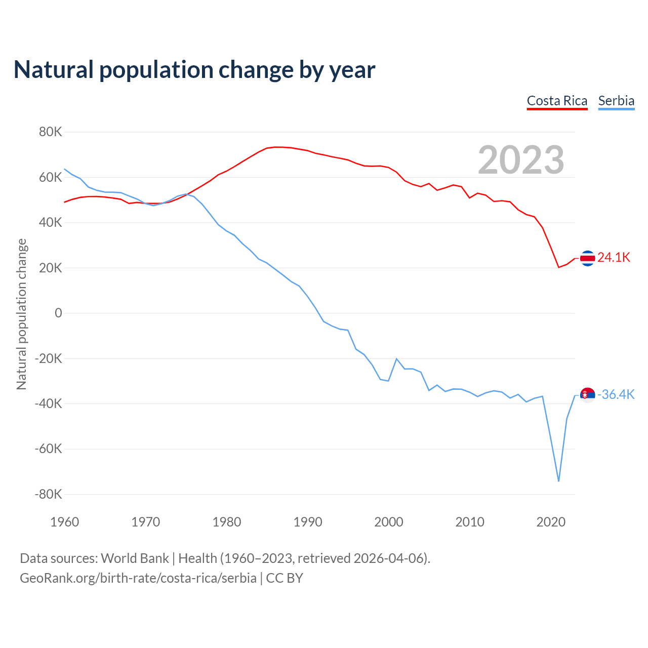 According to the latest available data on birth rates, the fertility rate in Costa Rica was 1.33 children per woman in 2023, compared to 1.61 in Serbia in 2023. The replacement level is considered to be 2.1 children per woman.