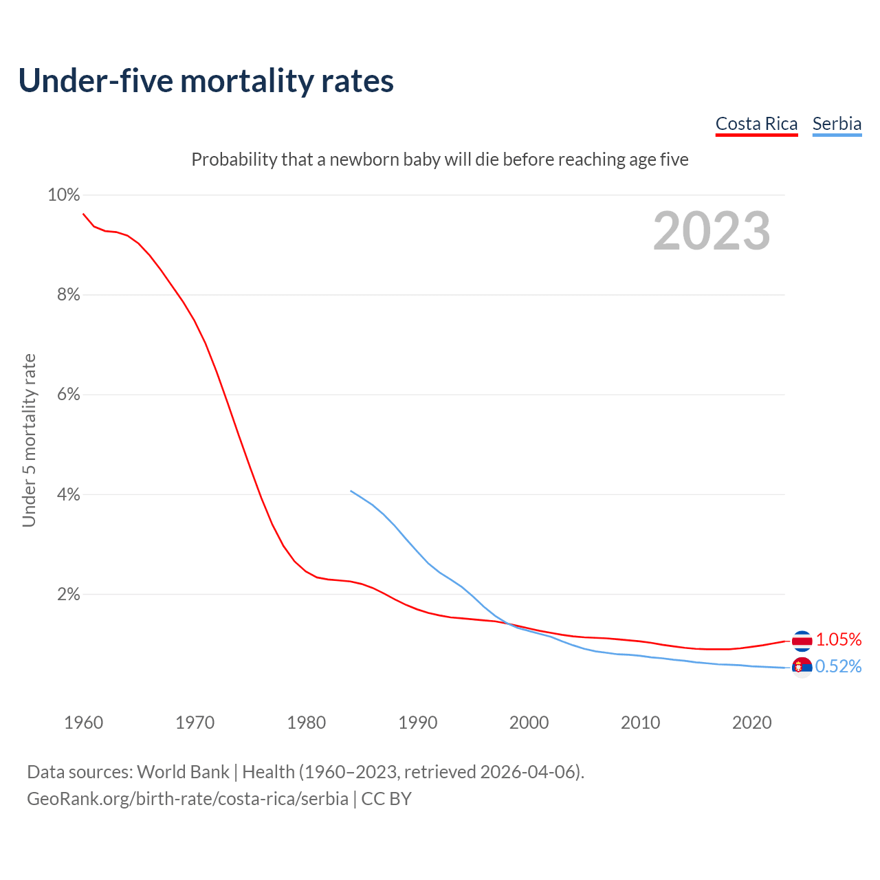 The chance that a newborn baby will die before reaching age five is 1.05% in Costa Rica and 0.52% in Serbia. Above is a chart with historical data on under-five mortality rates.