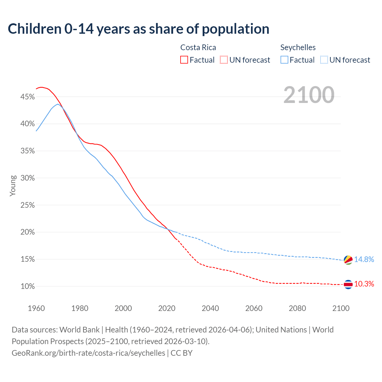 According to the latest available data on birth rates, the fertility rate in Costa Rica was 1.33 children per woman in 2023, compared to 2.02 in the Seychelles in 2023. The replacement level is considered to be 2.1 children per woman.