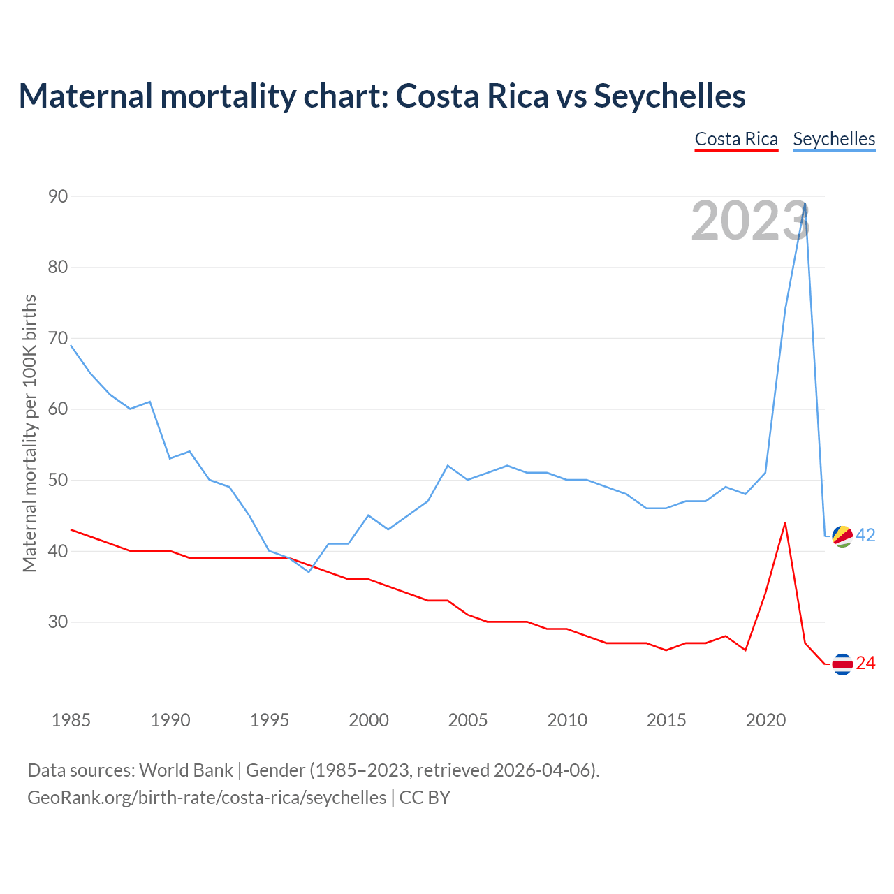 The maternal mortality rate, which is the probability of dying during childbirth or within 42 days of pregnancy termination, is 24 deaths per 100,000 live births in Costa Rica, compared to 42 deaths in the Seychelles.