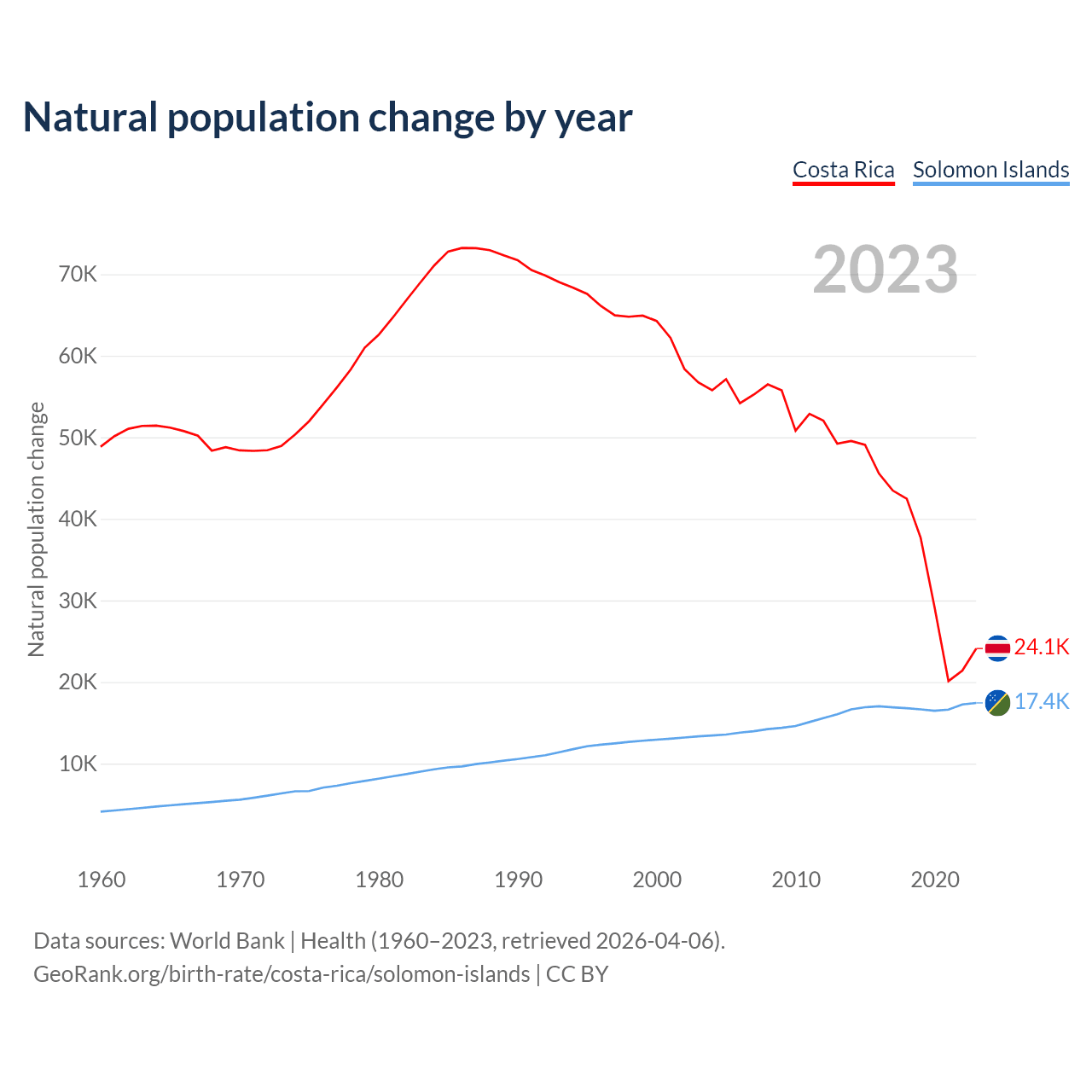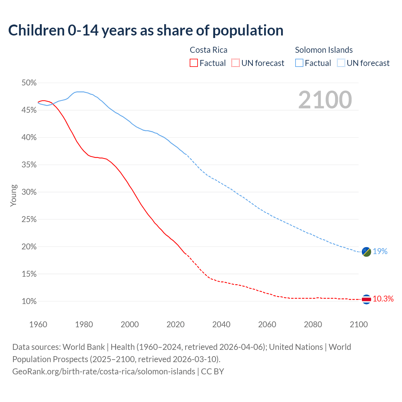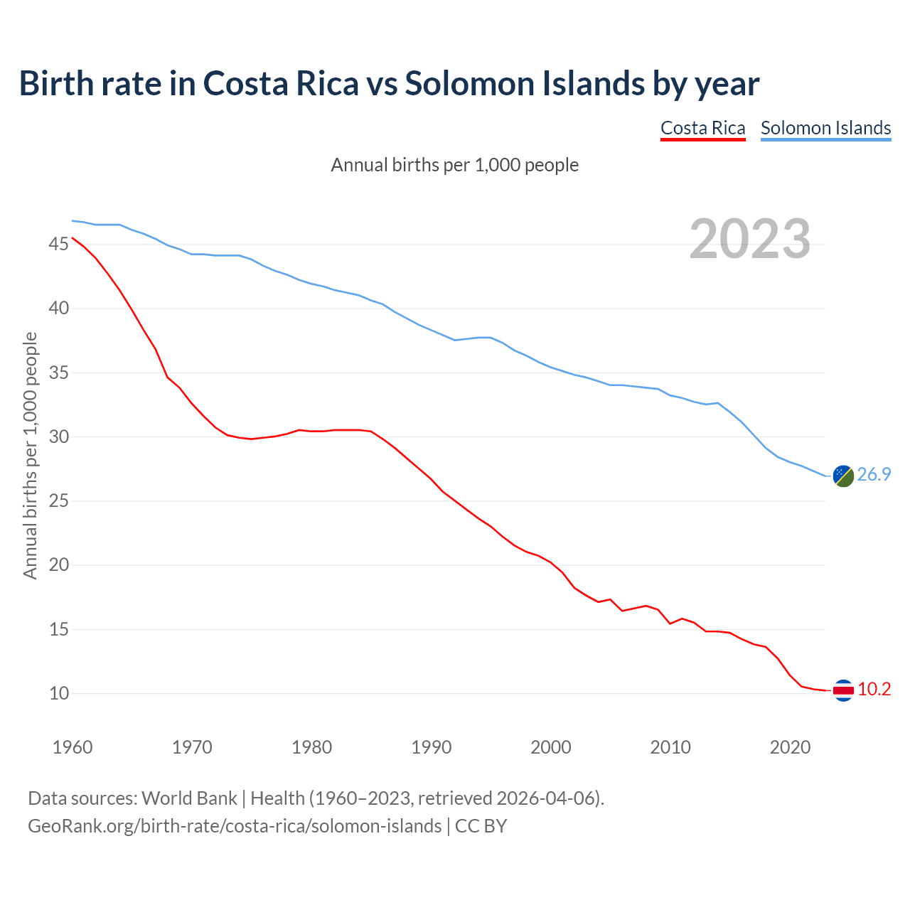 Costa Rica has an annual birth rate of 10.2 births per 1,000 people, compared to 26.9 for the Solomon Islands. The average number of children a woman is expected to have during her lifetime — the fertility rate, is 1.33 in Costa Rica and 3.56 in the Solomon Islands — 167.4% difference.