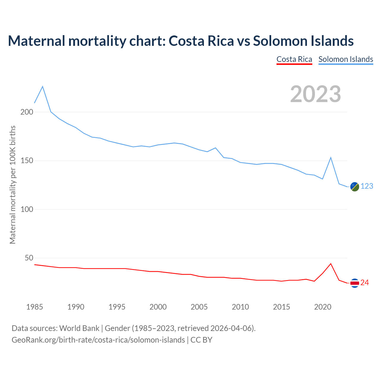 The maternal mortality rate, which is the probability of dying during childbirth or within 42 days of pregnancy termination, is 24 deaths per 100,000 live births in Costa Rica, compared to 123 deaths in the Solomon Islands.