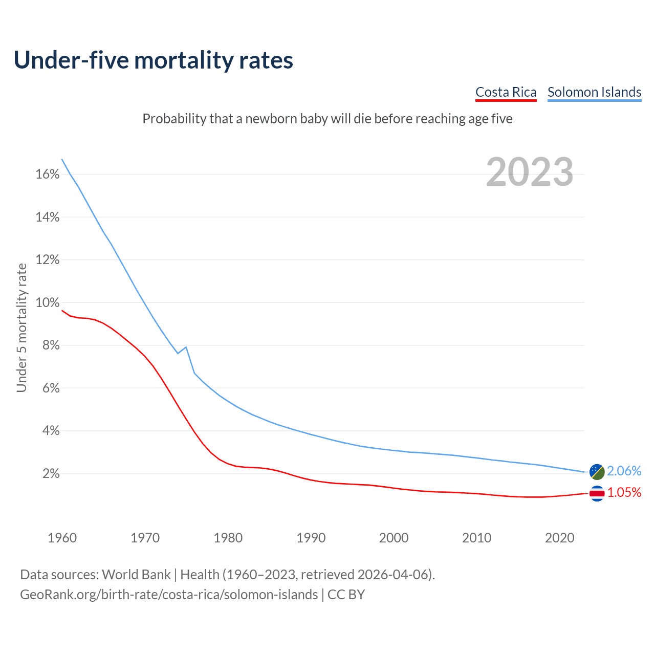 The chance that a newborn baby will die before reaching age five is 1.05% in Costa Rica and 2.06% in the Solomon Islands. Above is a chart with historical data on under-five mortality rates.