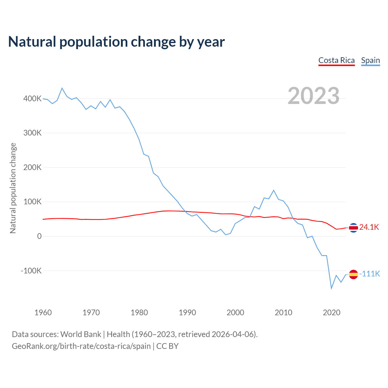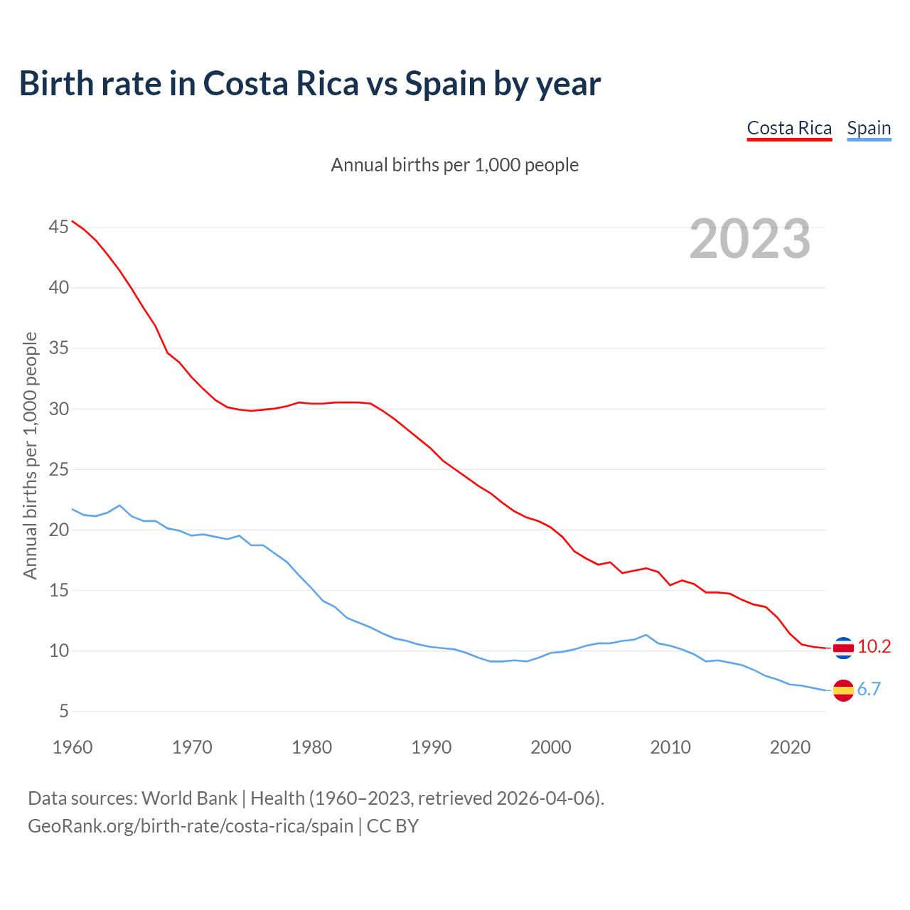 According to the latest available data on birth rates, the fertility rate in Costa Rica was 1.33 children per woman in 2023, compared to 1.12 in Spain in 2023. The replacement level is considered to be 2.1 children per woman.