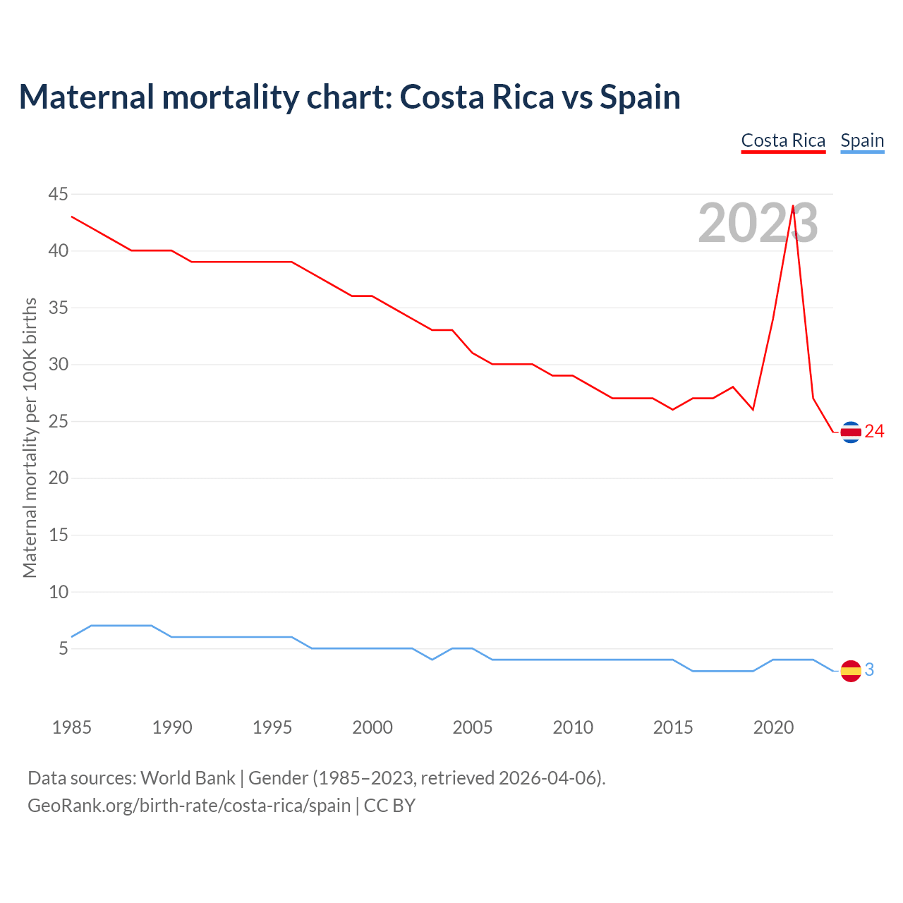 The maternal mortality rate, which is the probability of dying during childbirth or within 42 days of pregnancy termination, is 24 deaths per 100,000 live births in Costa Rica, compared to 3 deaths in Spain.
