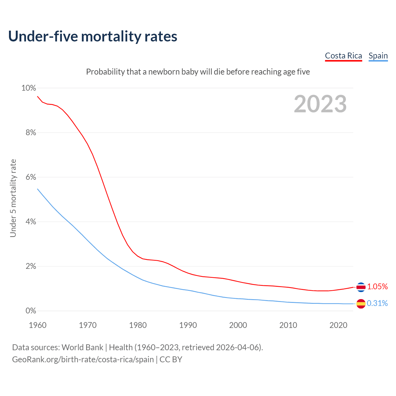 The chance that a newborn baby will die before reaching age five is 1.05% in Costa Rica and 0.31% in Spain. Above is a chart with historical data on under-five mortality rates.