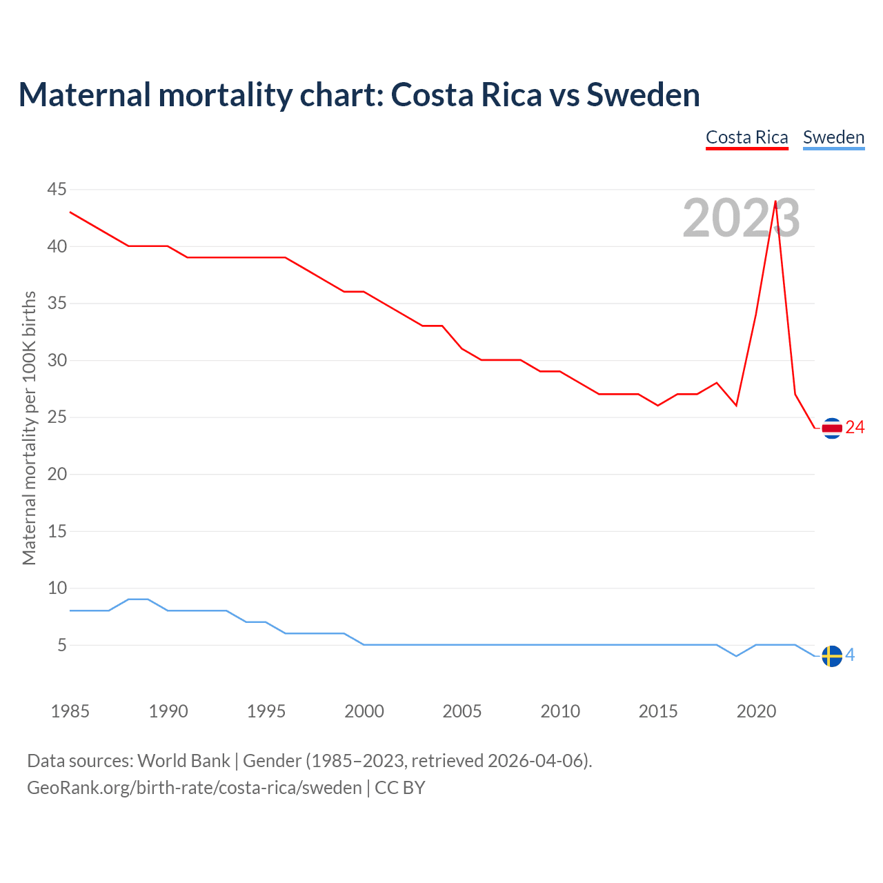 The maternal mortality rate, which is the probability of dying during childbirth or within 42 days of pregnancy termination, is 24 deaths per 100,000 live births in Costa Rica, compared to 4 deaths in Sweden.