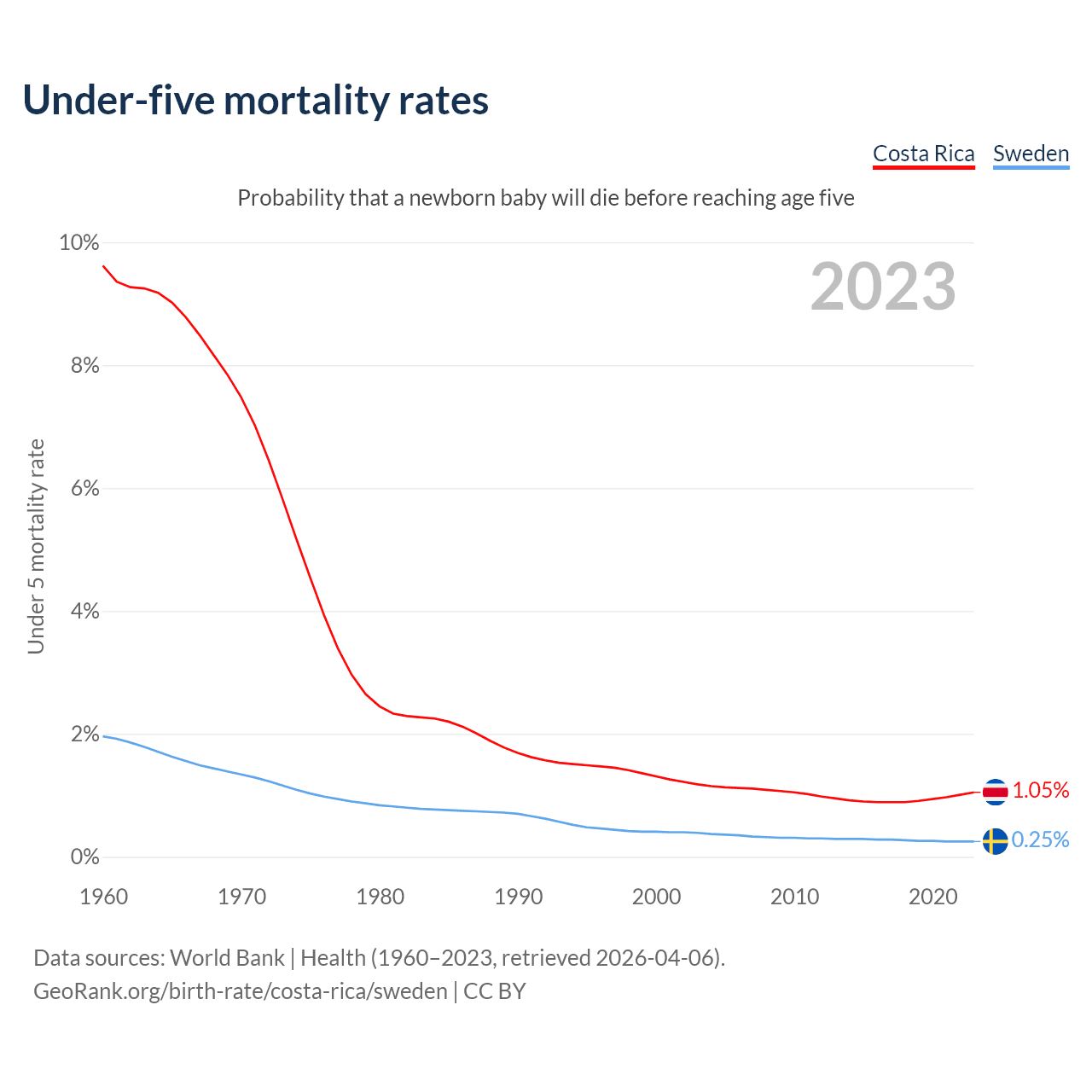 The chance that a newborn baby will die before reaching age five is 1.05% in Costa Rica and 0.25% in Sweden. Above is a chart with historical data on under-five mortality rates.