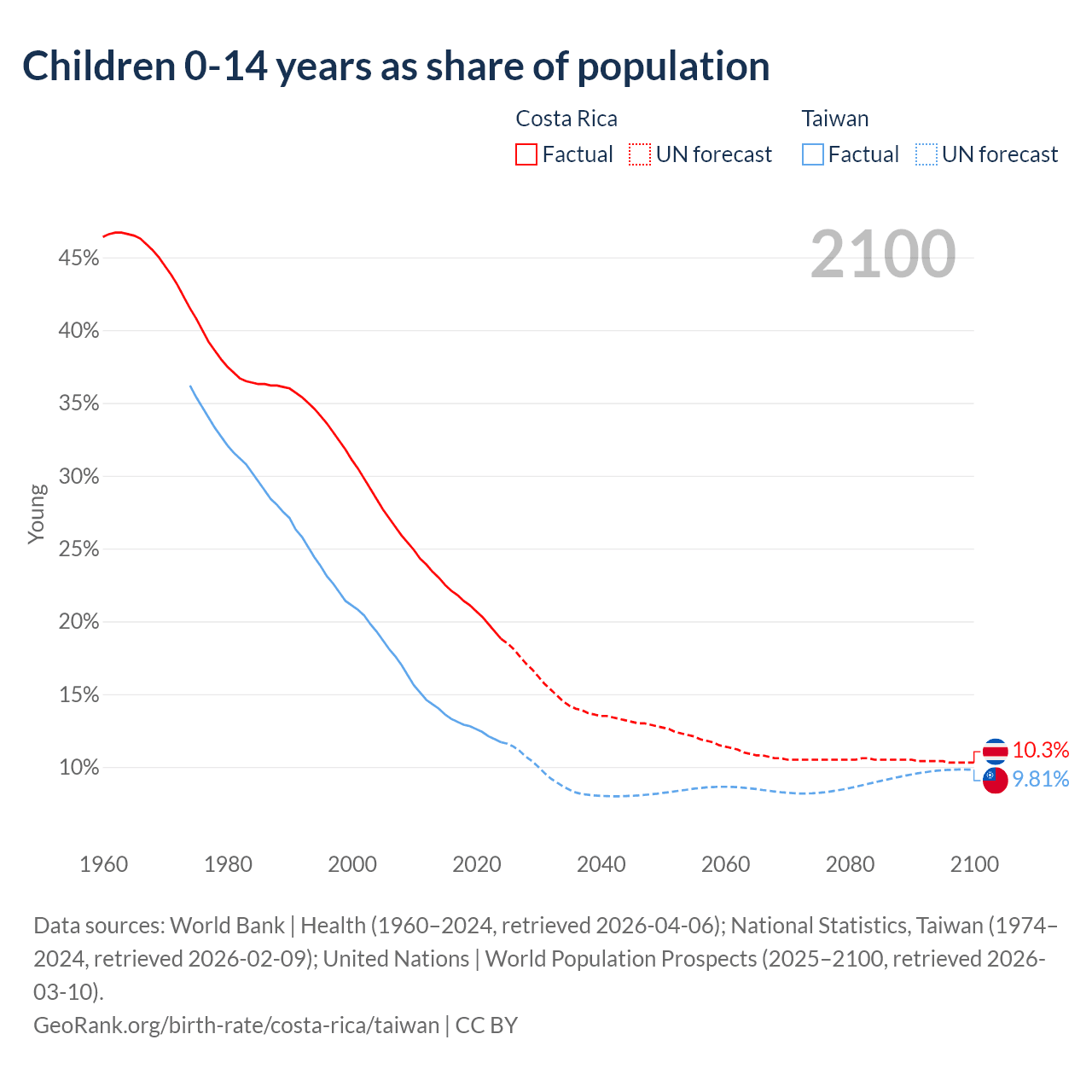 Children aged 0-14 make up 18.8% of the population in Costa Rica and 11.7% in Taiwan in 2024, compared to 36% and 27.1% respectively in 1990.