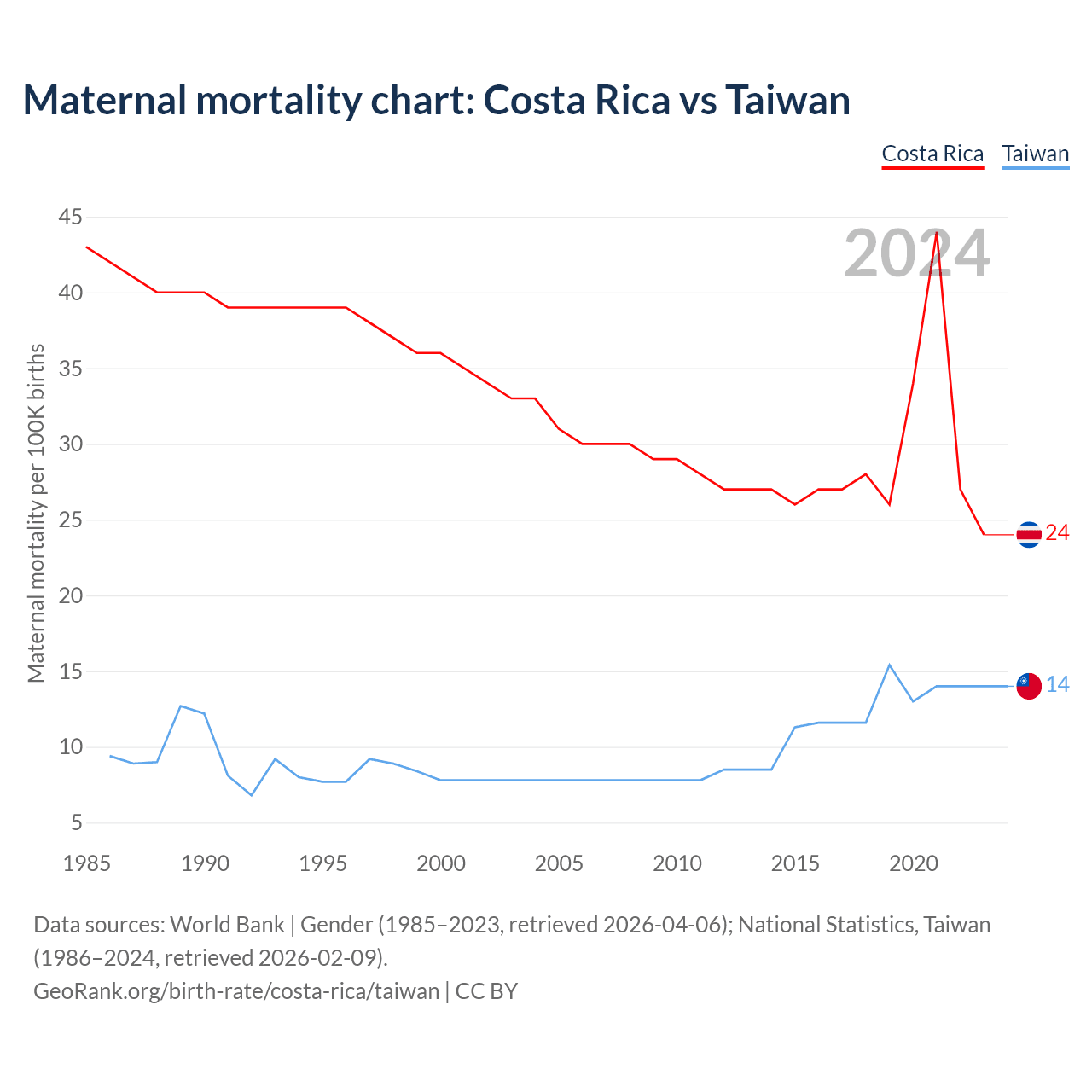 The maternal mortality rate, which is the probability of dying during childbirth or within 42 days of pregnancy termination, is 24 deaths per 100,000 live births in Costa Rica, compared to 14 deaths in Taiwan.