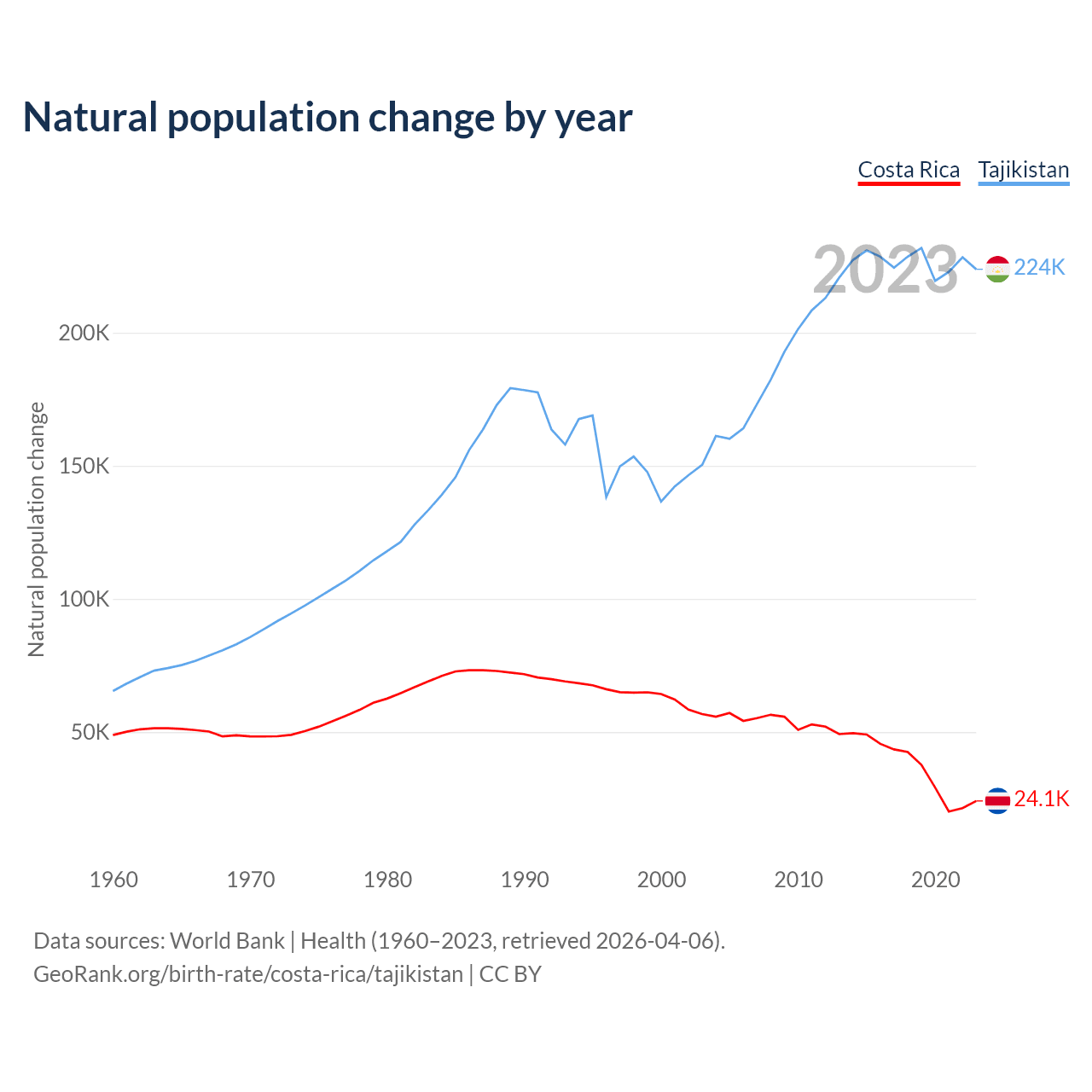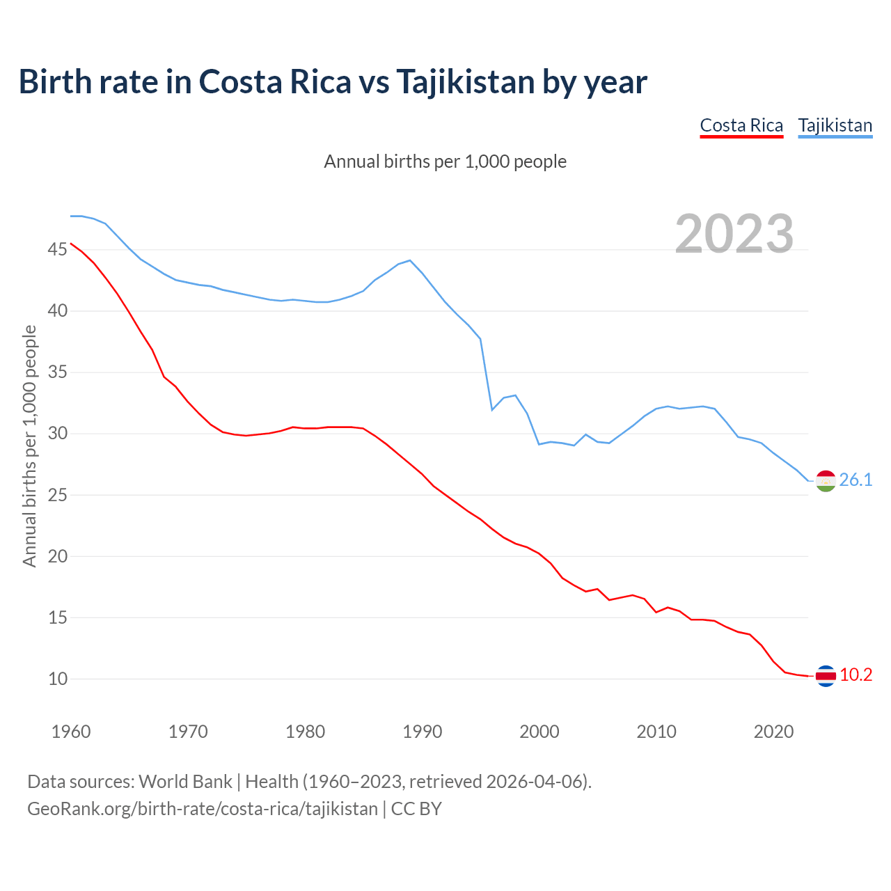 Costa Rica has an annual birth rate of 10.2 births per 1,000 people, compared to 26.1 for Tajikistan. The average number of children a woman is expected to have during her lifetime — the fertility rate, is 1.33 in Costa Rica and 3.07 in Tajikistan — 131% difference.