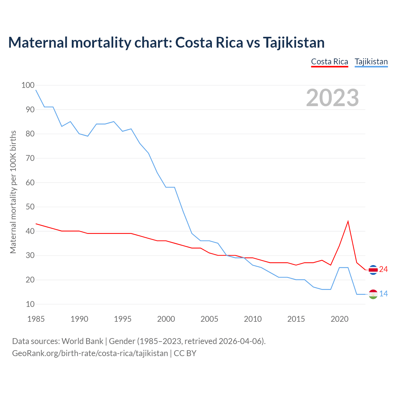 The maternal mortality rate, which is the probability of dying during childbirth or within 42 days of pregnancy termination, is 24 deaths per 100,000 live births in Costa Rica, compared to 14 deaths in Tajikistan.