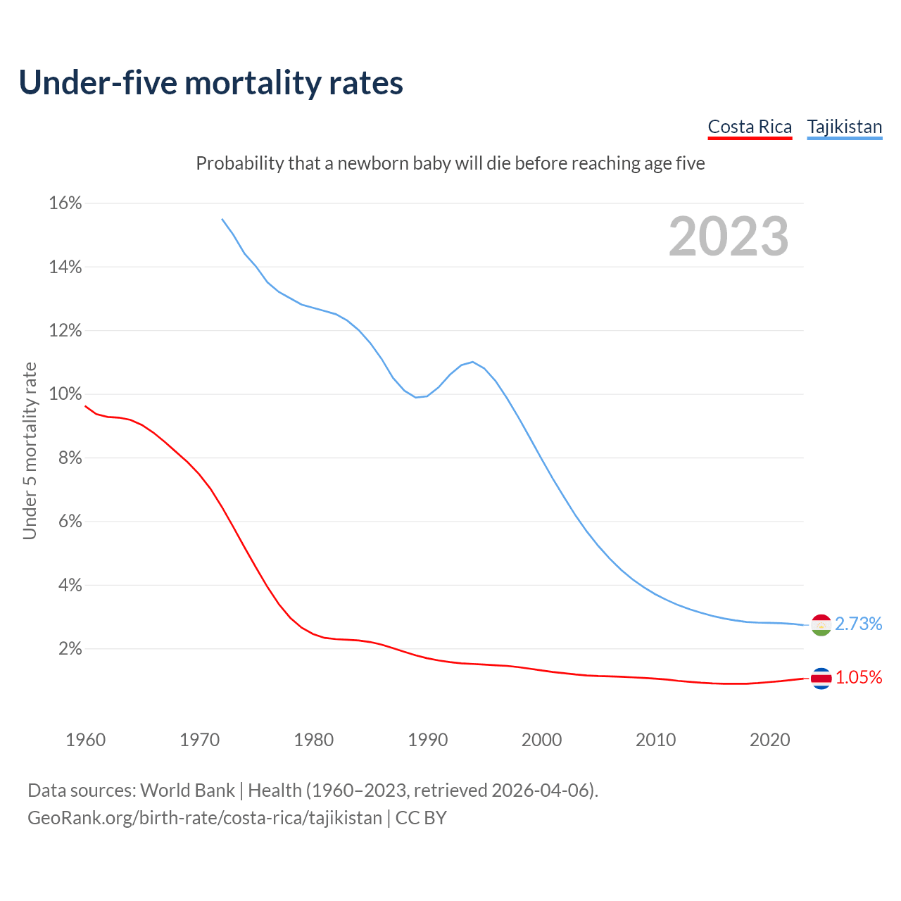 The chance that a newborn baby will die before reaching age five is 1.05% in Costa Rica and 2.73% in Tajikistan. Above is a chart with historical data on under-five mortality rates.
