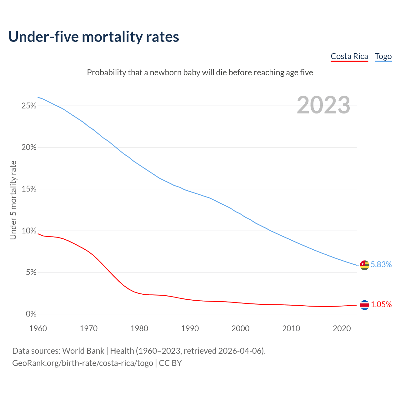 The chance that a newborn baby will die before reaching age five is 1.05% in Costa Rica and 5.83% in Togo. Above is a chart with historical data on under-five mortality rates.