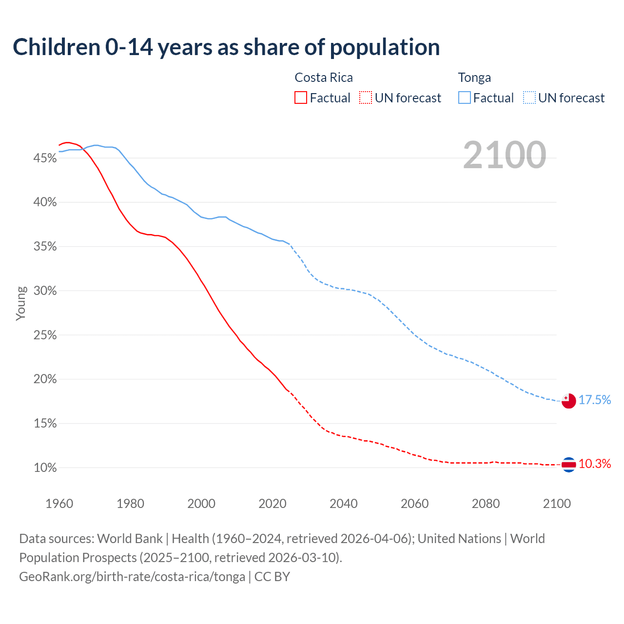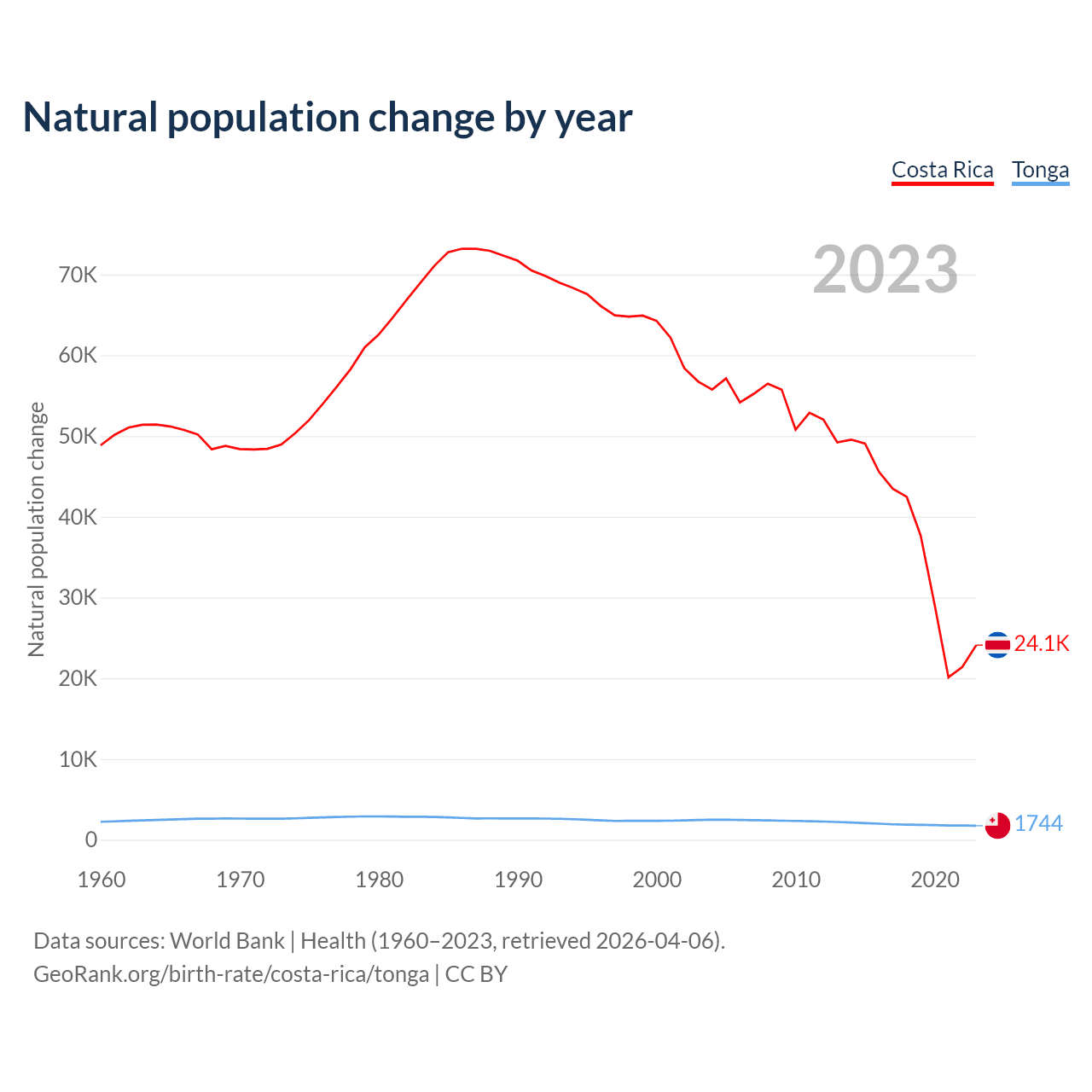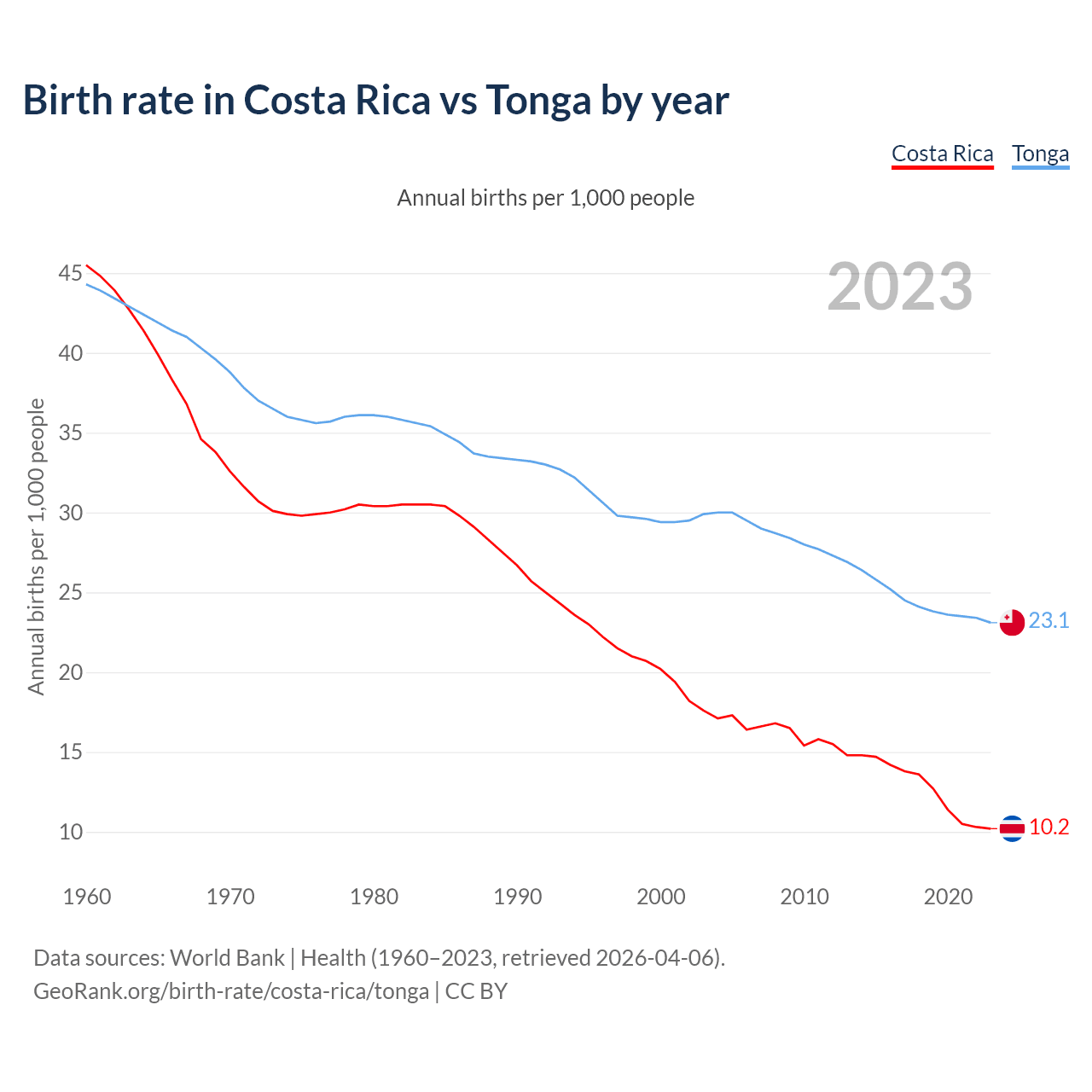 Costa Rica has an annual birth rate of 10.2 births per 1,000 people, compared to 23.1 for Tonga. The average number of children a woman is expected to have during her lifetime — the fertility rate, is 1.33 in Costa Rica and 3.13 in Tonga — 135.3% difference.