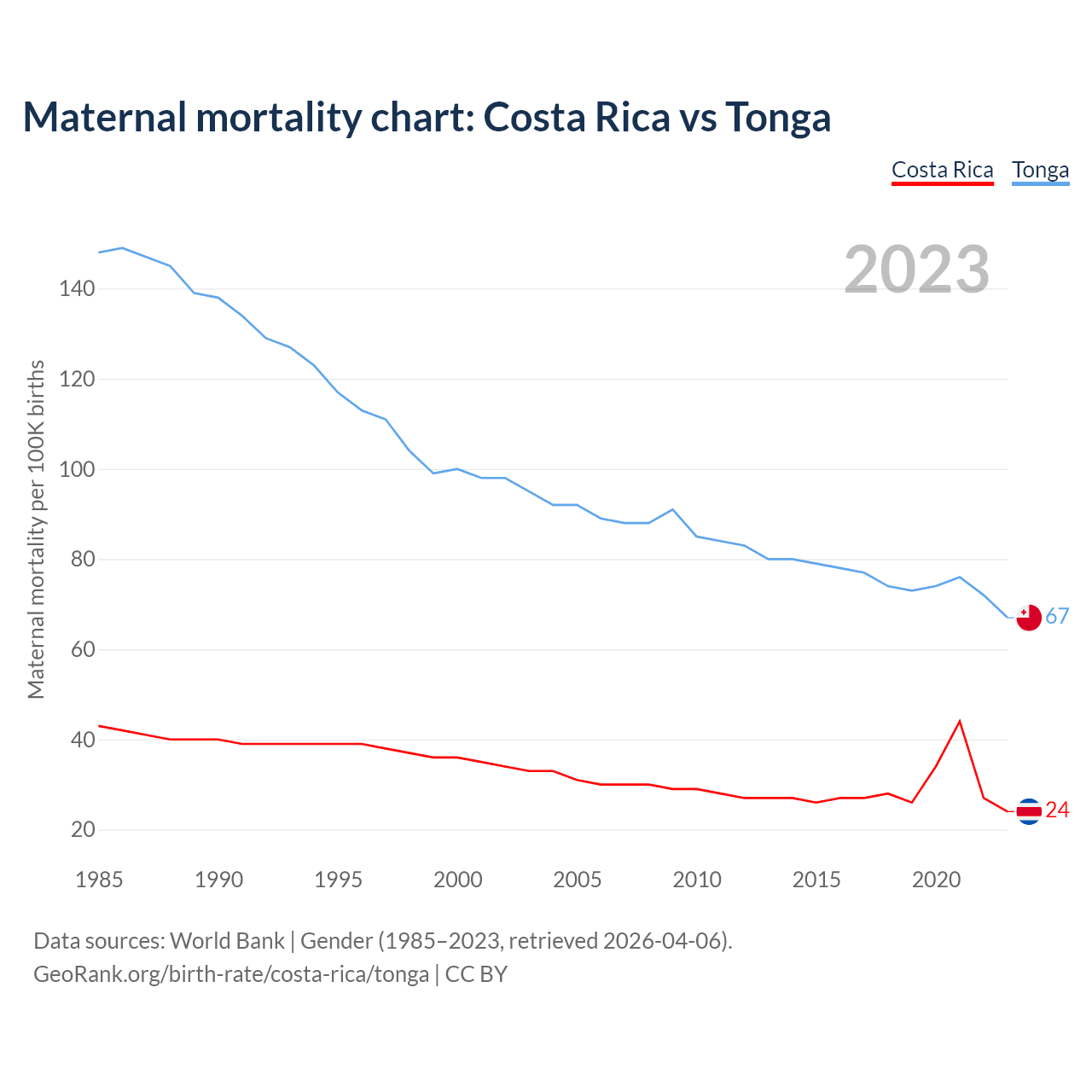 - Annual births per 1,000 women ages 15-19 (adolescent birth rate or teenage mother rate) is 26.3 in Costa Rica vs 24.8 in Tonga.