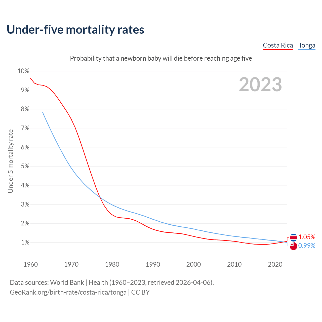 The chance that a newborn baby will die before reaching age five is 1.05% in Costa Rica and 0.99% in Tonga. Above is a chart with historical data on under-five mortality rates.