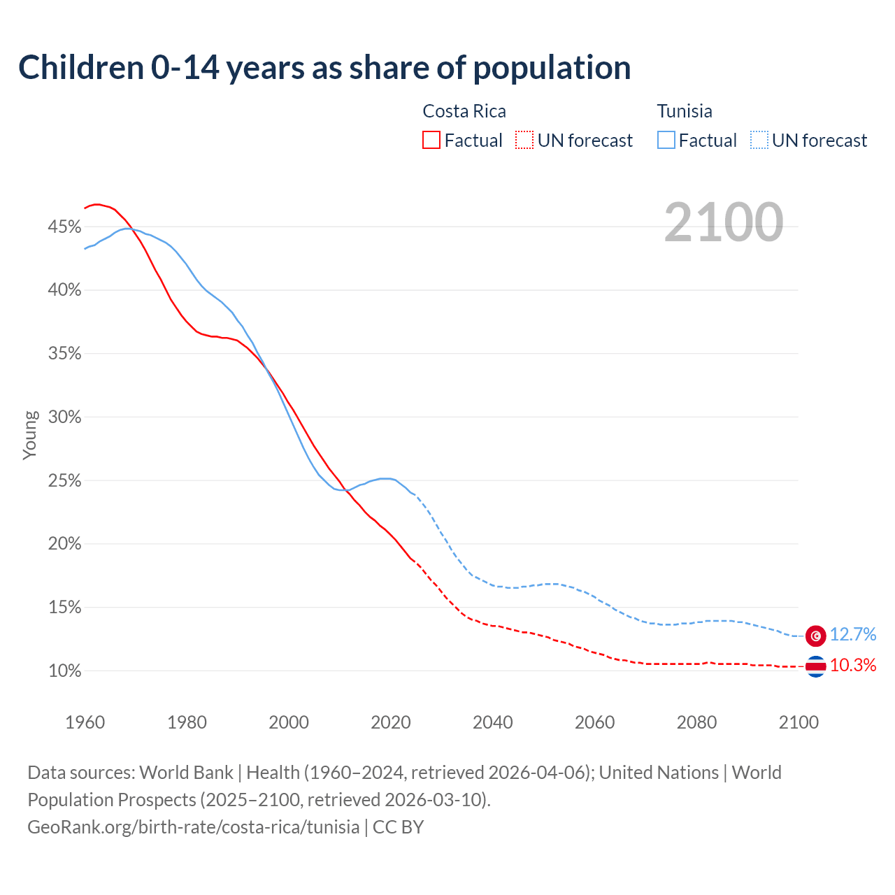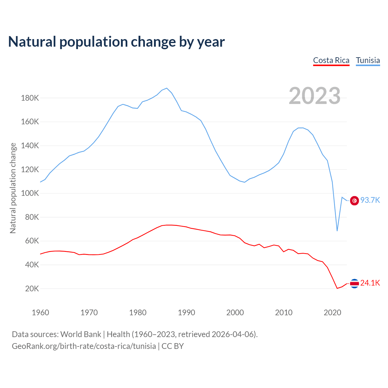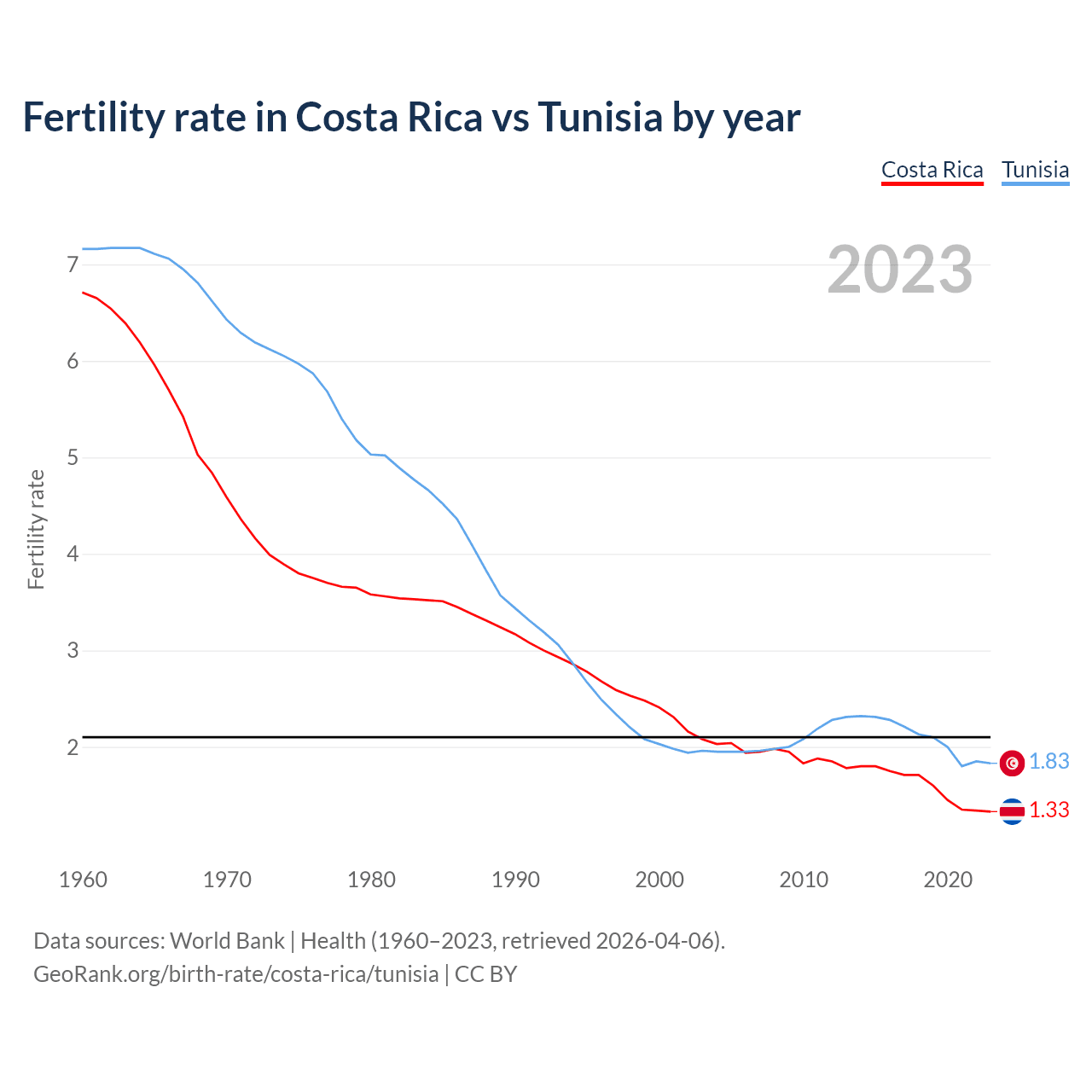 According to the latest available data on birth rates, the fertility rate in Costa Rica was 1.33 children per woman in 2023, compared to 1.83 in Tunisia in 2023. The replacement level is considered to be 2.1 children per woman.