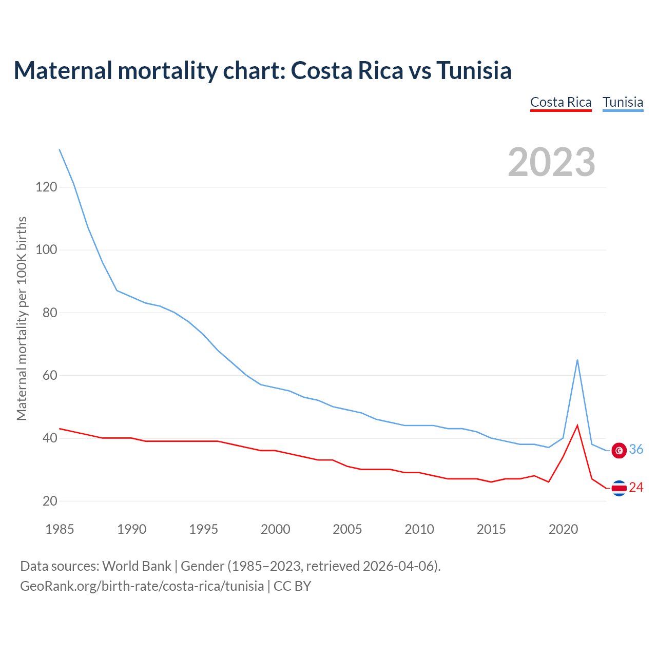 The maternal mortality rate, which is the probability of dying during childbirth or within 42 days of pregnancy termination, is 24 deaths per 100,000 live births in Costa Rica, compared to 36 deaths in Tunisia.