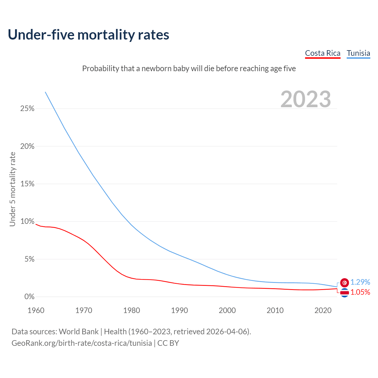 The chance that a newborn baby will die before reaching age five is 1.05% in Costa Rica and 1.29% in Tunisia. Above is a chart with historical data on under-five mortality rates.