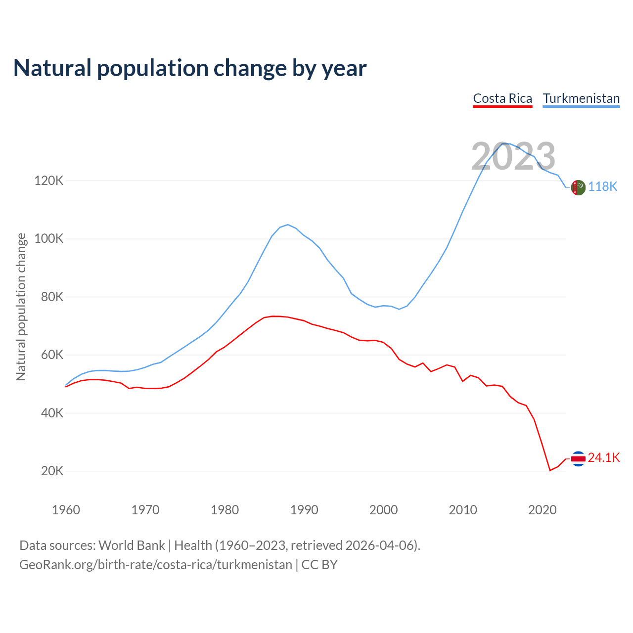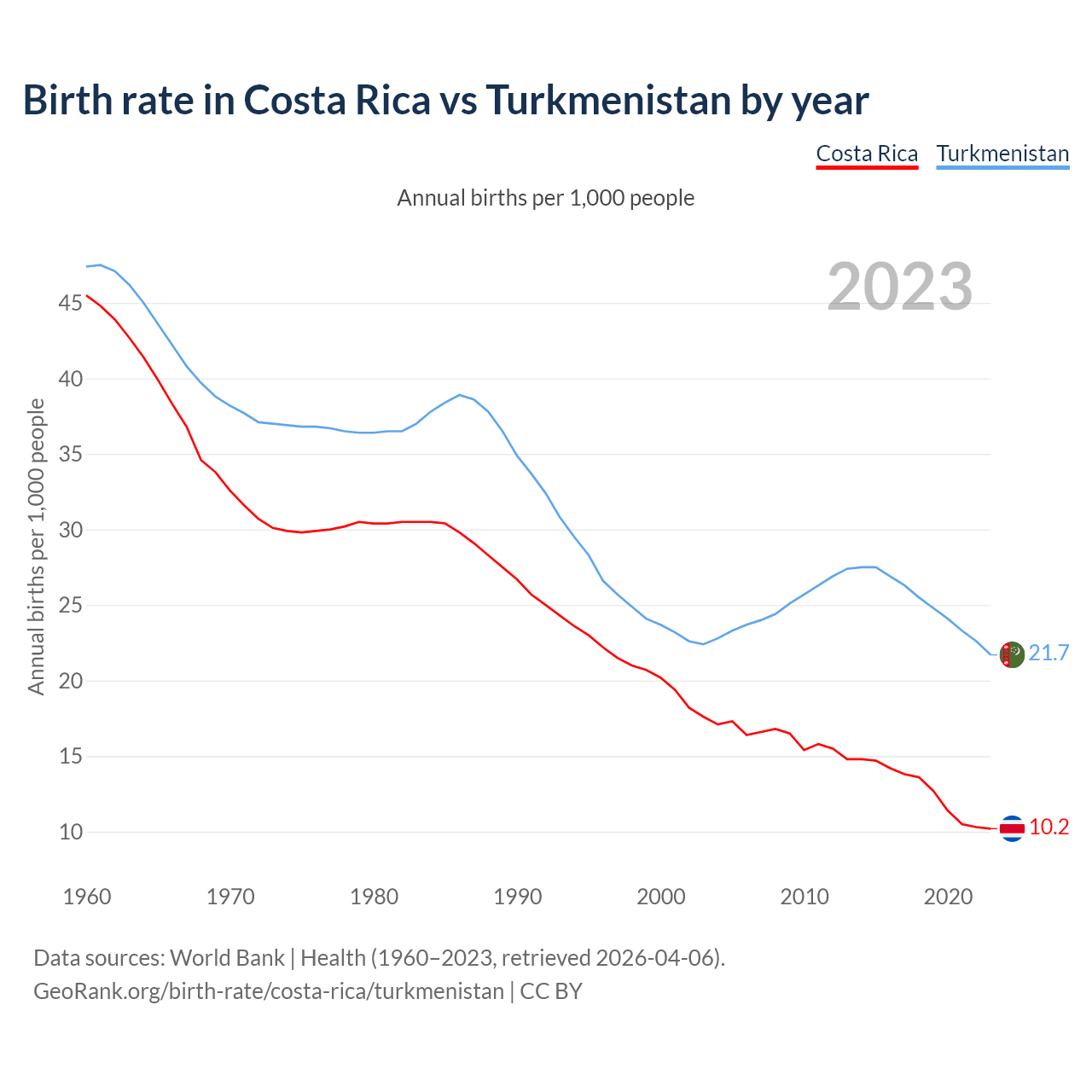 Costa Rica has an annual birth rate of 10.2 births per 1,000 people, compared to 21.7 for Turkmenistan. The average number of children a woman is expected to have during her lifetime — the fertility rate, is 1.33 in Costa Rica and 2.69 in Turkmenistan — 102.3% difference.