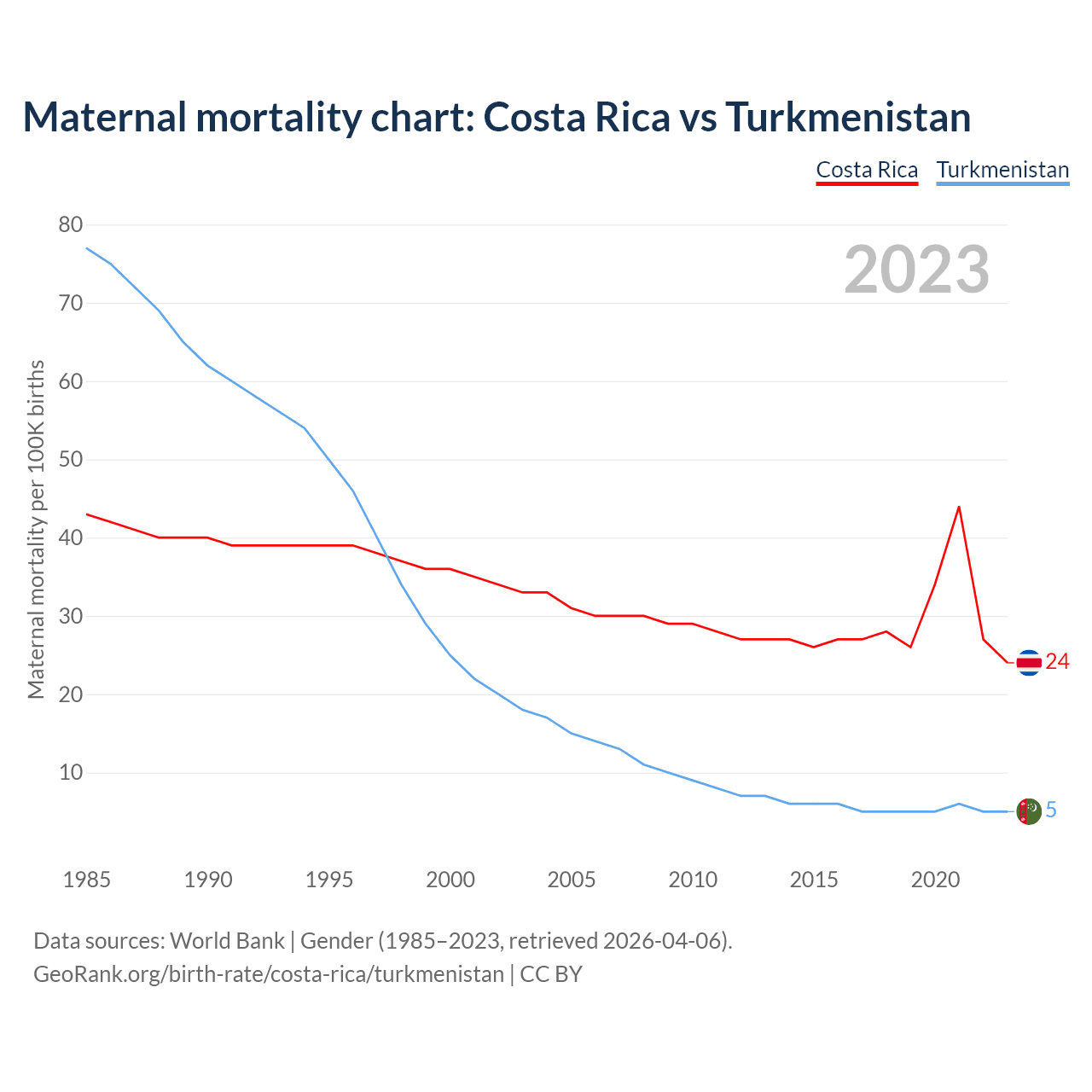 - Annual births per 1,000 women ages 15-19 (adolescent birth rate or teenage mother rate) is 26.3 in Costa Rica vs 21.2 in Turkmenistan.