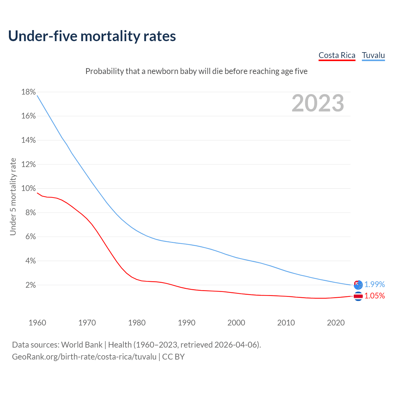 The chance that a newborn baby will die before reaching age five is 1.05% in Costa Rica and 1.99% in Tuvalu. Above is a chart with historical data on under-five mortality rates.
