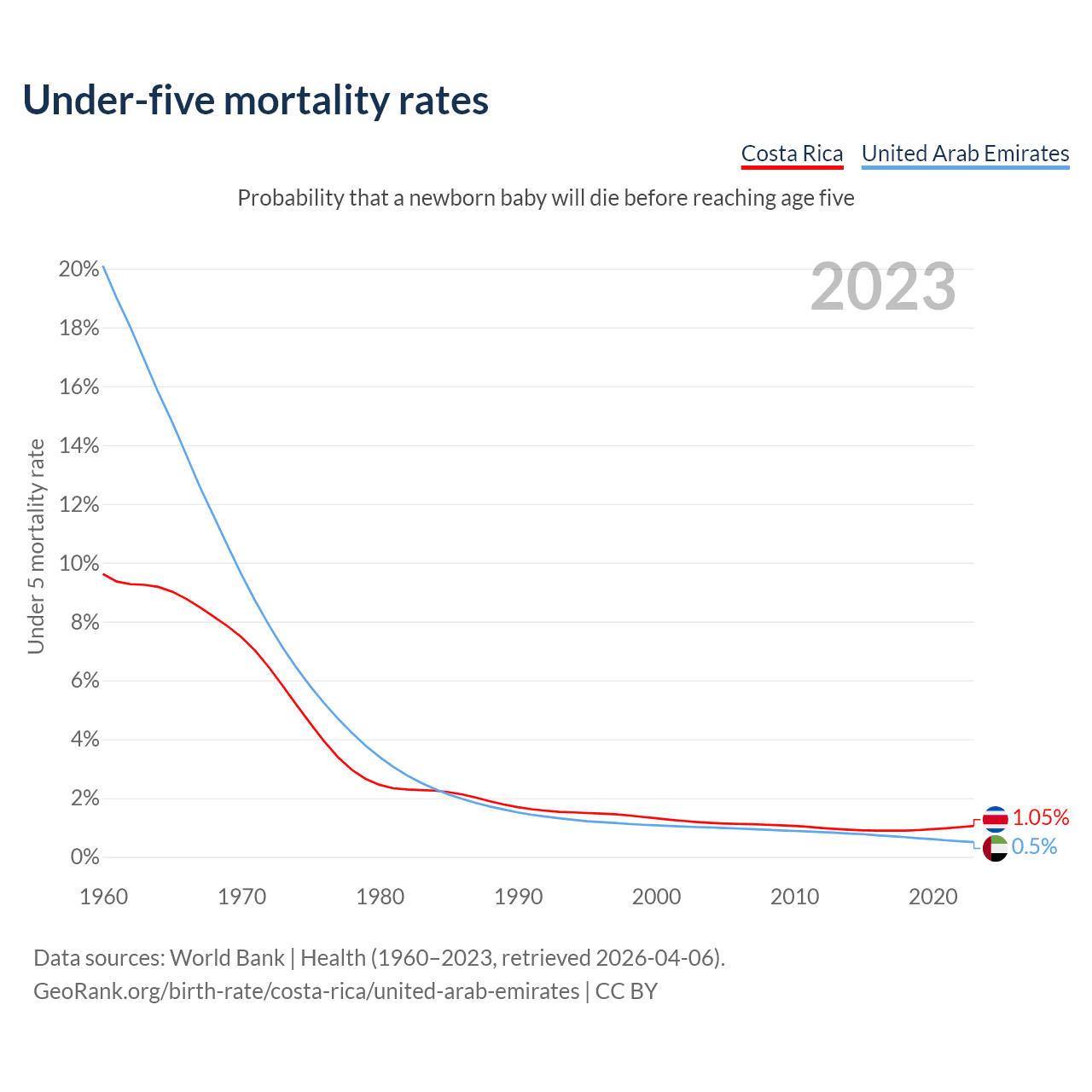 The chance that a newborn baby will die before reaching age five is 1.05% in Costa Rica and 0.5% in the United Arab Emirates. Above is a chart with historical data on under-five mortality rates.