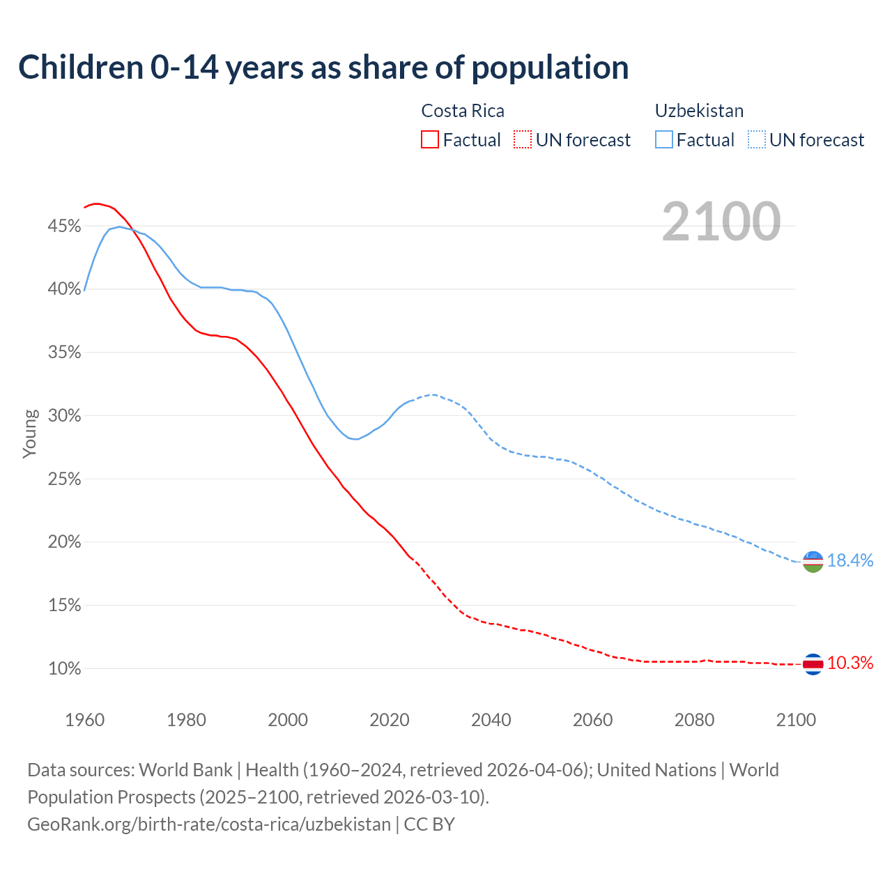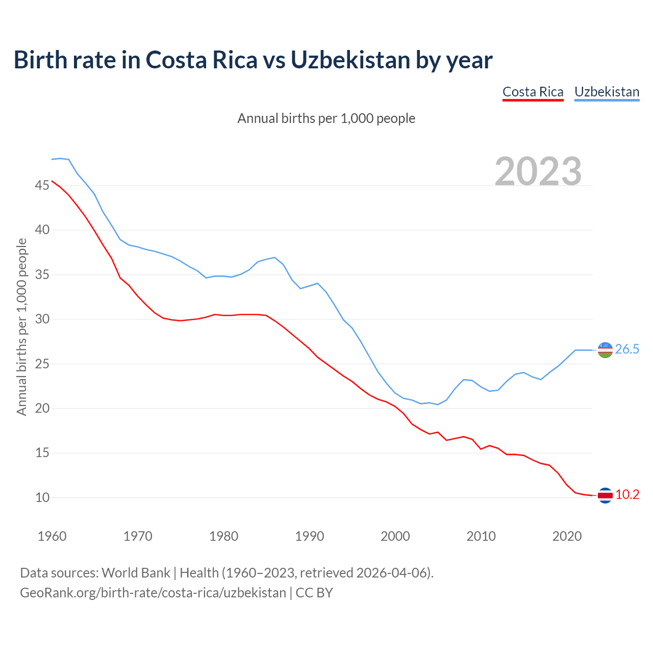 Costa Rica has an annual birth rate of 10.2 births per 1,000 people, compared to 26.5 for Uzbekistan. The average number of children a woman is expected to have during her lifetime — the fertility rate, is 1.33 in Costa Rica and 3.5 in Uzbekistan — 163.2% difference.
