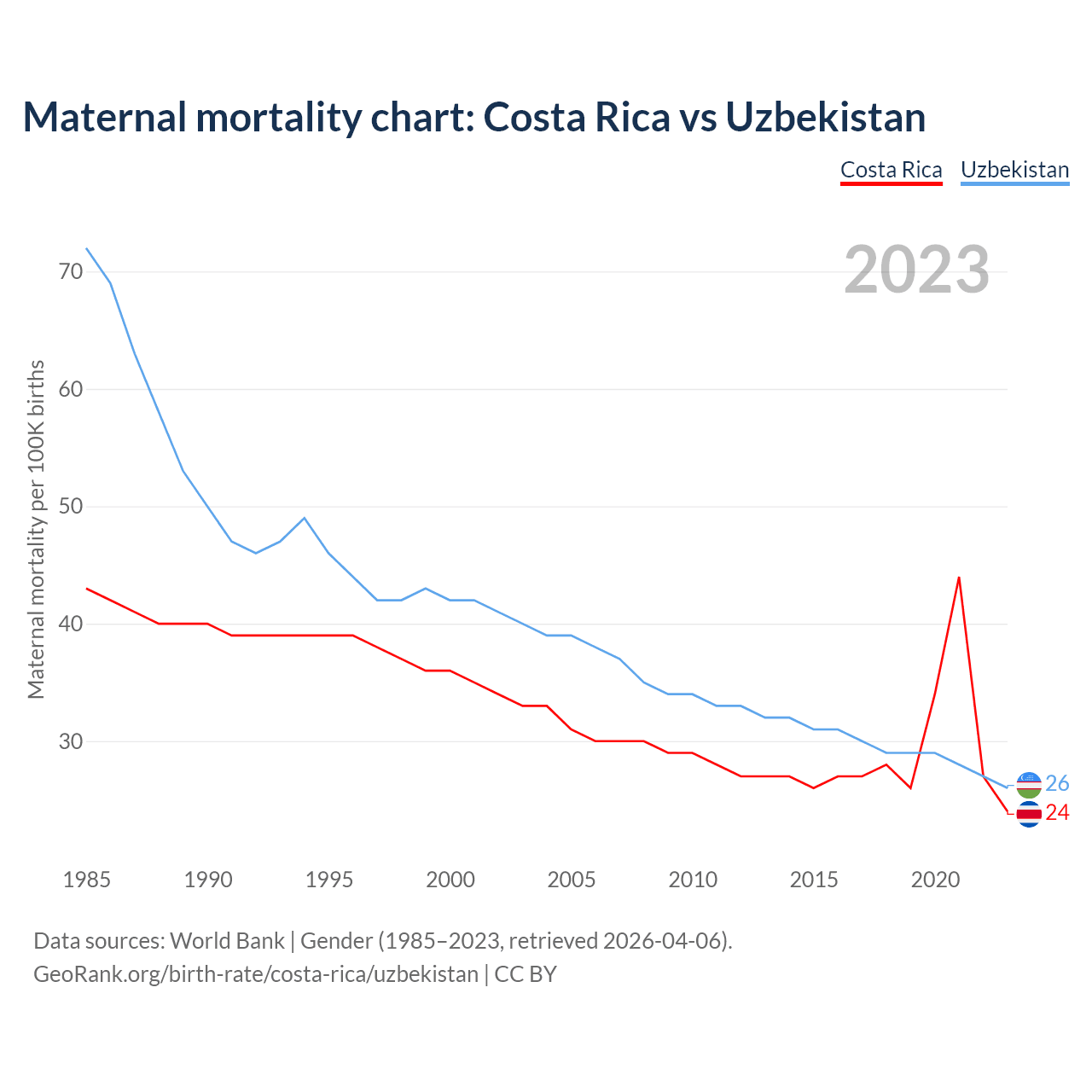 The maternal mortality rate, which is the probability of dying during childbirth or within 42 days of pregnancy termination, is 24 deaths per 100,000 live births in Costa Rica, compared to 26 deaths in Uzbekistan.