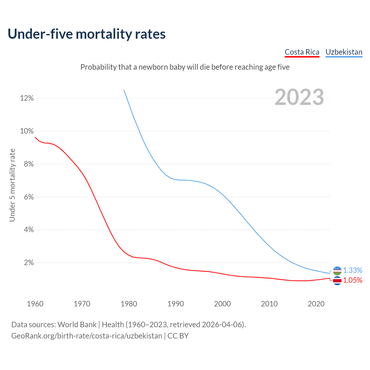 The chance that a newborn baby will die before reaching age five is 1.05% in Costa Rica and 1.33% in Uzbekistan. Above is a chart with historical data on under-five mortality rates.
