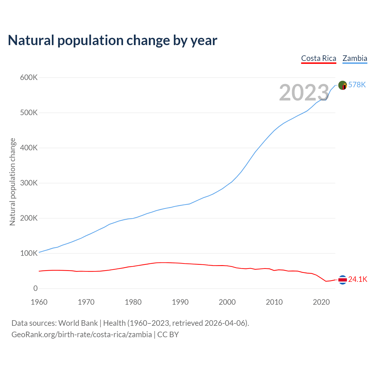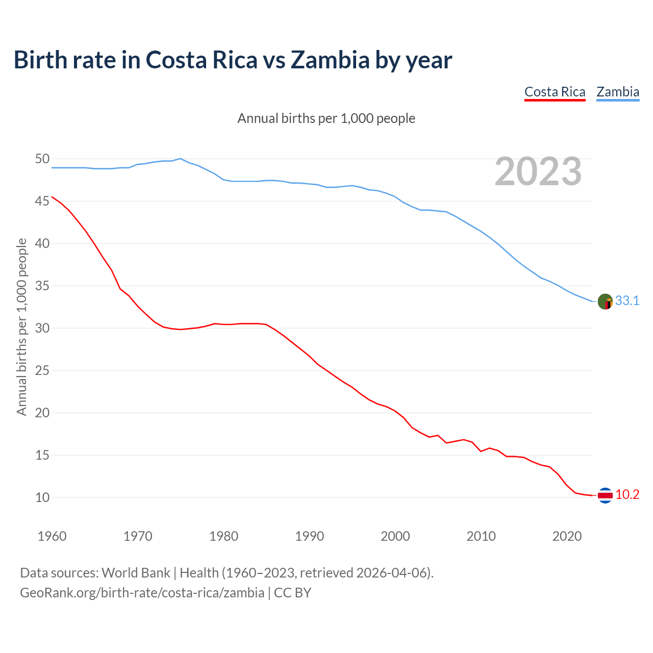 Costa Rica has an annual birth rate of 10.2 births per 1,000 people, compared to 33.1 for Zambia. The average number of children a woman is expected to have during her lifetime — the fertility rate, is 1.33 in Costa Rica and 4.1 in Zambia — 208.3% difference.