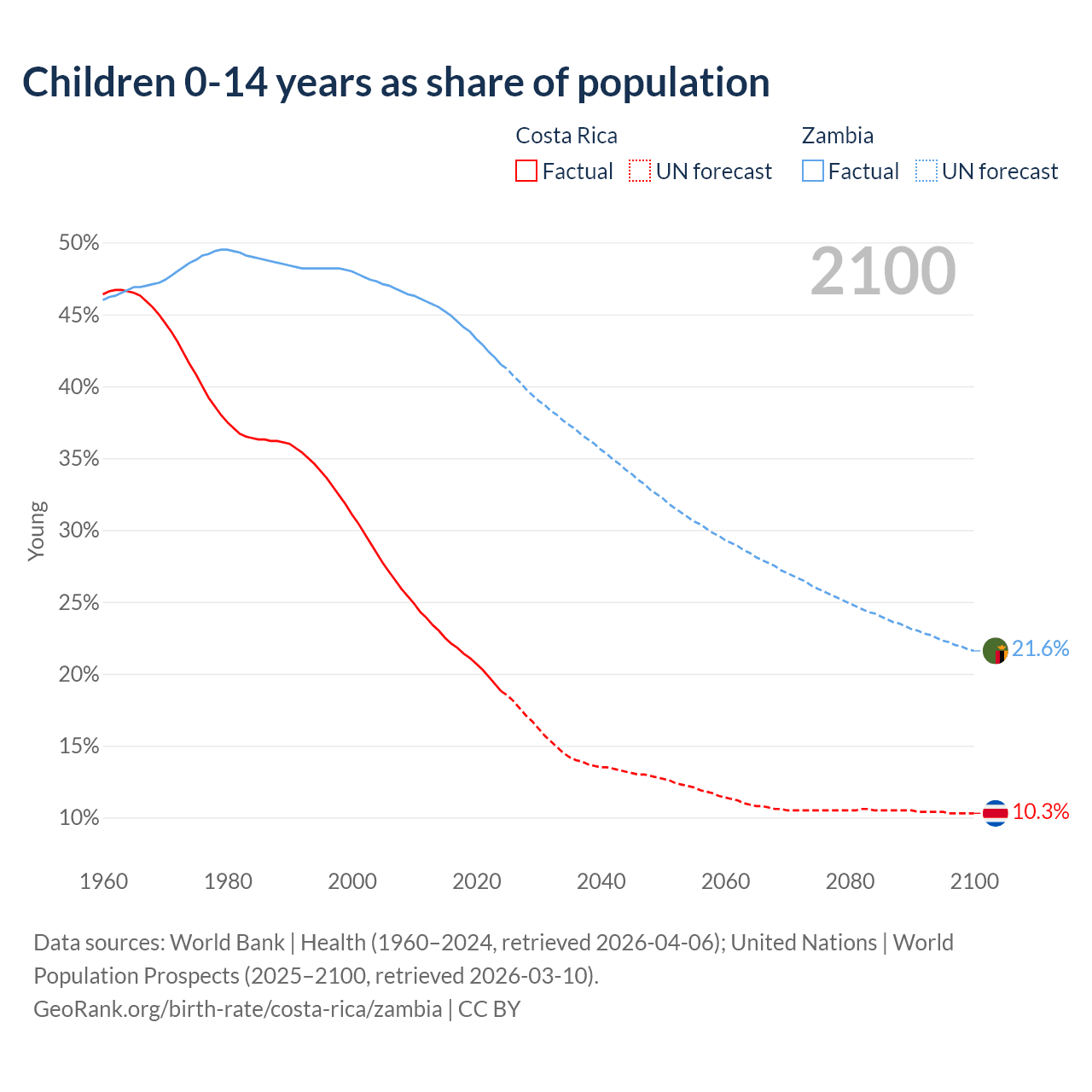 According to the latest available data on birth rates, the fertility rate in Costa Rica was 1.33 children per woman in 2023, compared to 4.1 in Zambia in 2023. The replacement level is considered to be 2.1 children per woman.