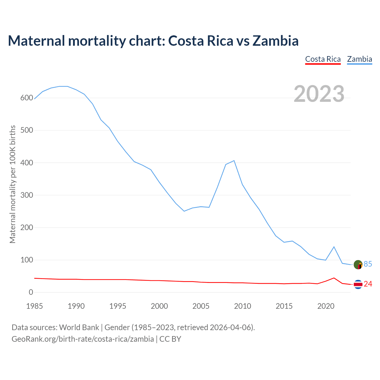 The maternal mortality rate, which is the probability of dying during childbirth or within 42 days of pregnancy termination, is 24 deaths per 100,000 live births in Costa Rica, compared to 85 deaths in Zambia.