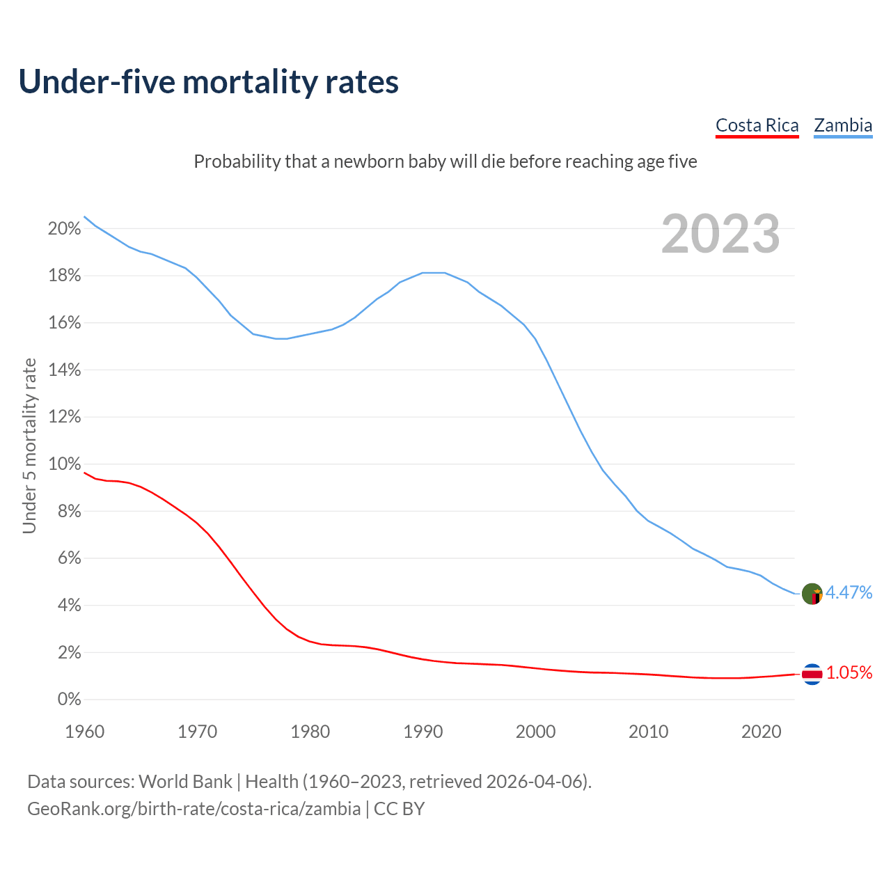 The chance that a newborn baby will die before reaching age five is 1.05% in Costa Rica and 4.47% in Zambia. Above is a chart with historical data on under-five mortality rates.