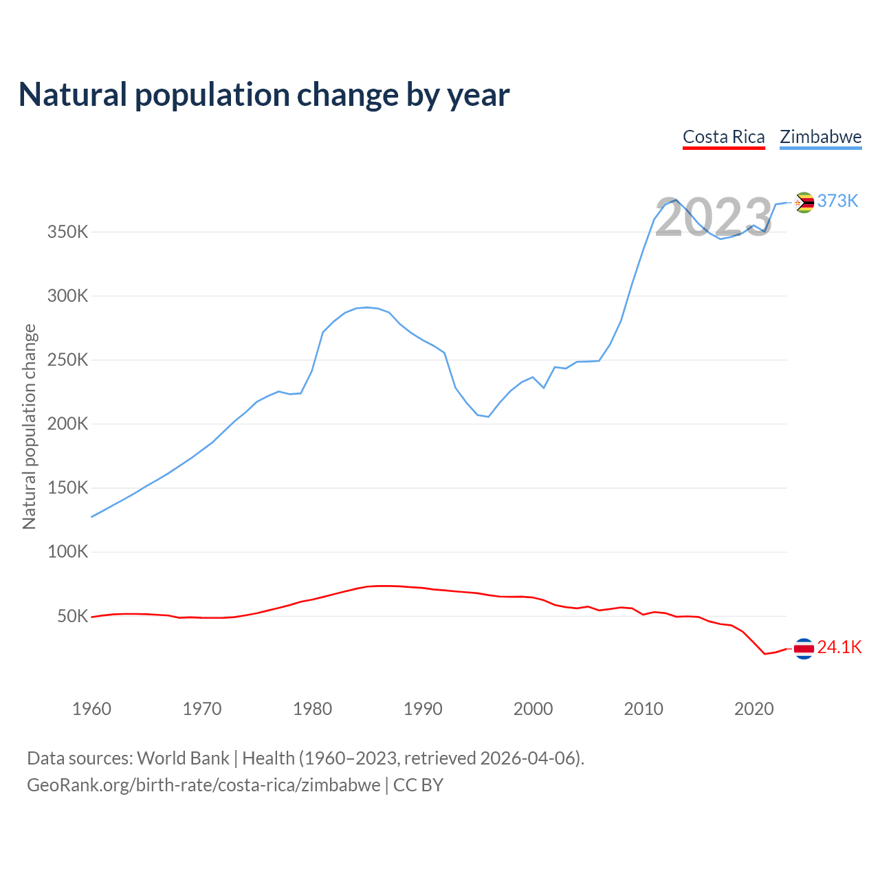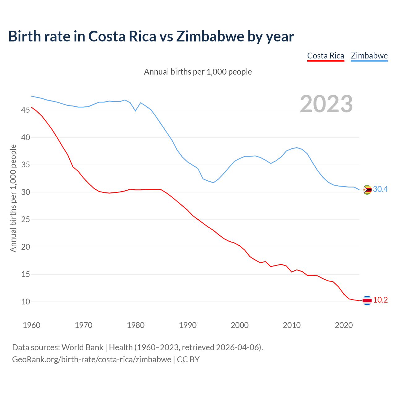 Costa Rica has an annual birth rate of 10.2 births per 1,000 people, compared to 30.4 for Zimbabwe. The average number of children a woman is expected to have during her lifetime — the fertility rate, is 1.33 in Costa Rica and 3.72 in Zimbabwe — 180% difference.