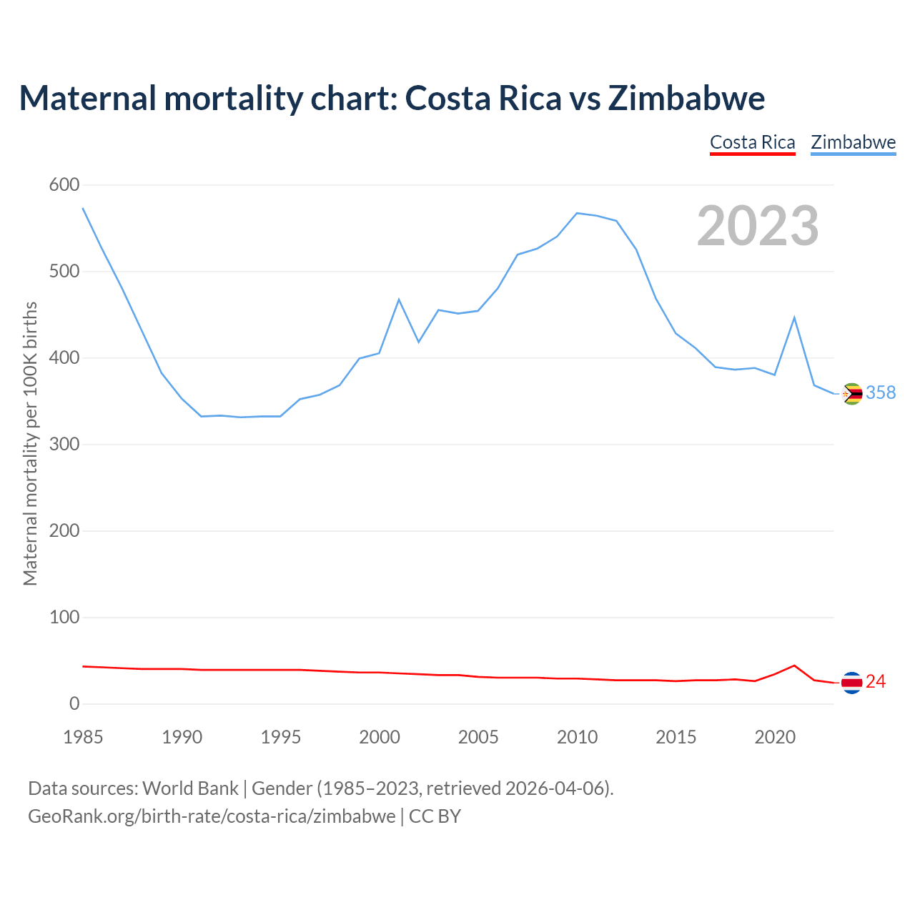 The maternal mortality rate, which is the probability of dying during childbirth or within 42 days of pregnancy termination, is 24 deaths per 100,000 live births in Costa Rica, compared to 358 deaths in Zimbabwe.