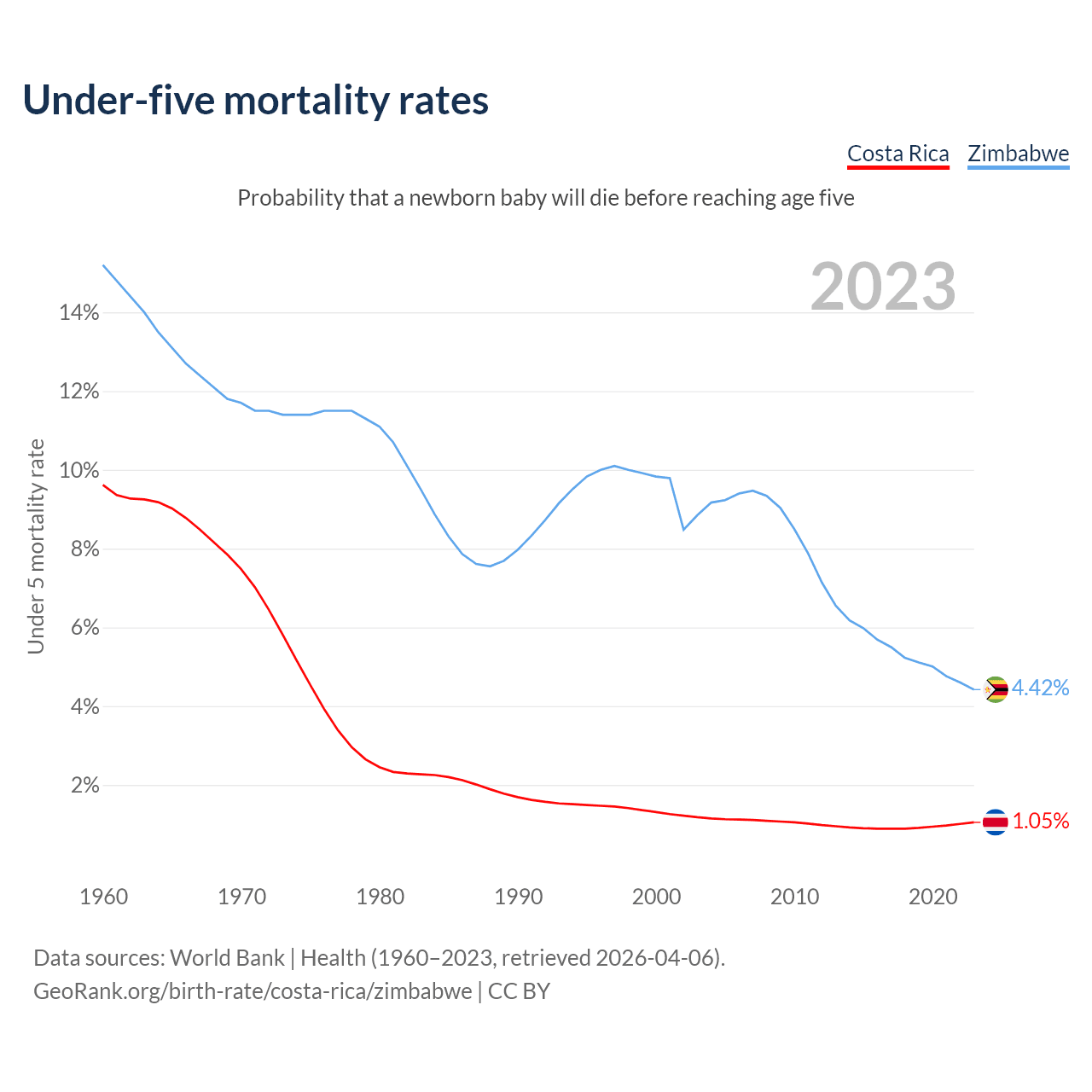 The chance that a newborn baby will die before reaching age five is 1.05% in Costa Rica and 4.42% in Zimbabwe. Above is a chart with historical data on under-five mortality rates.